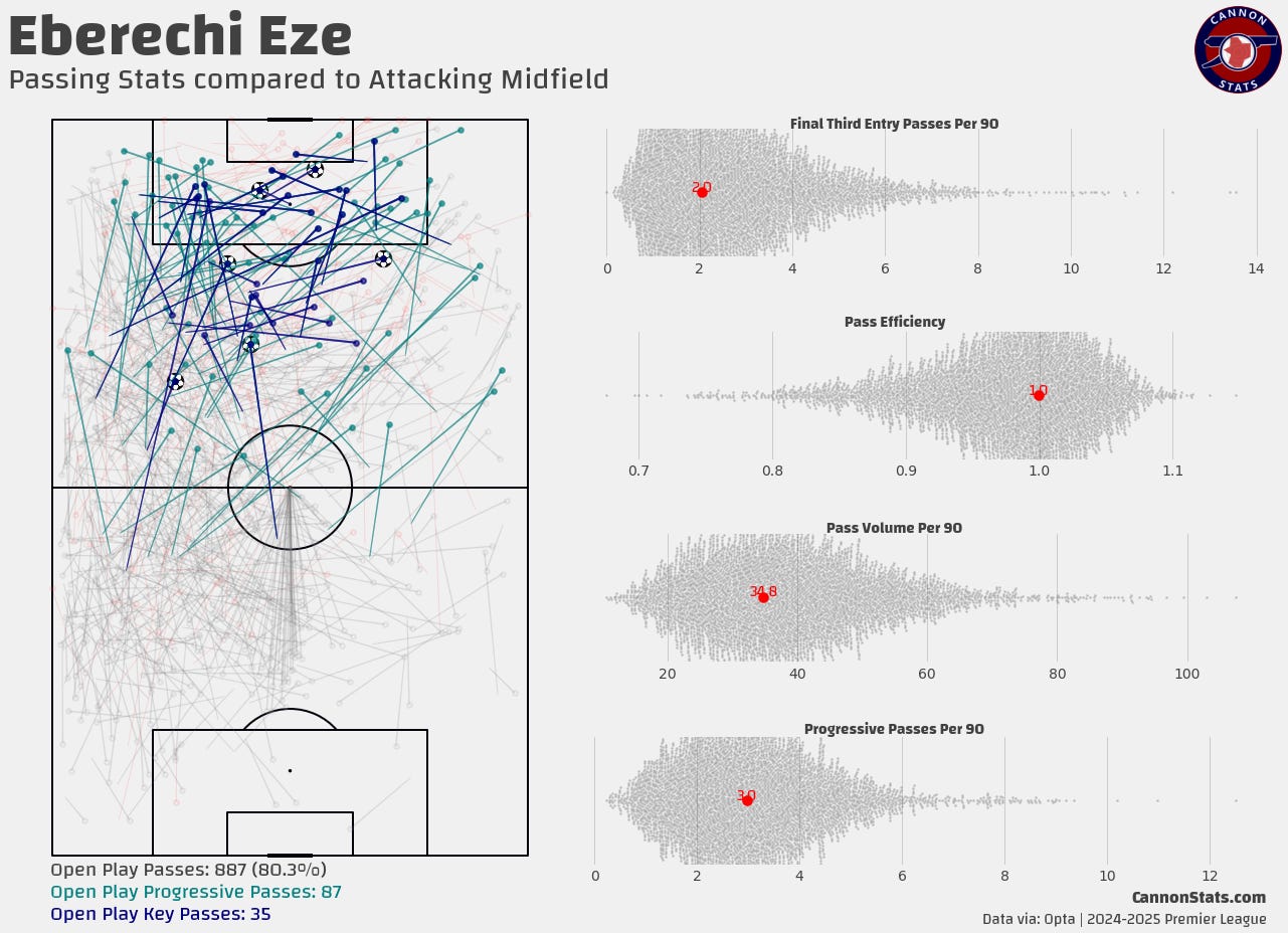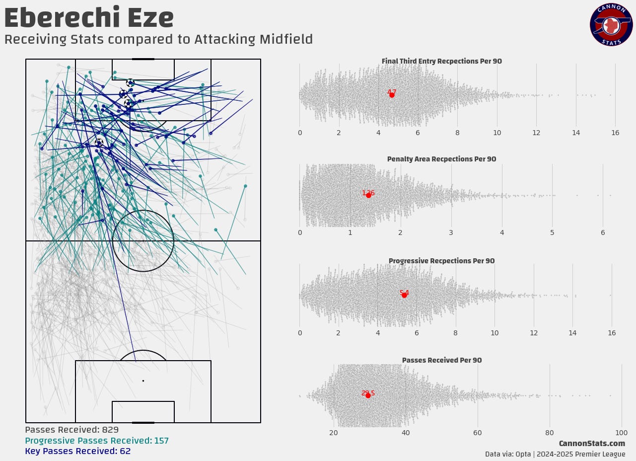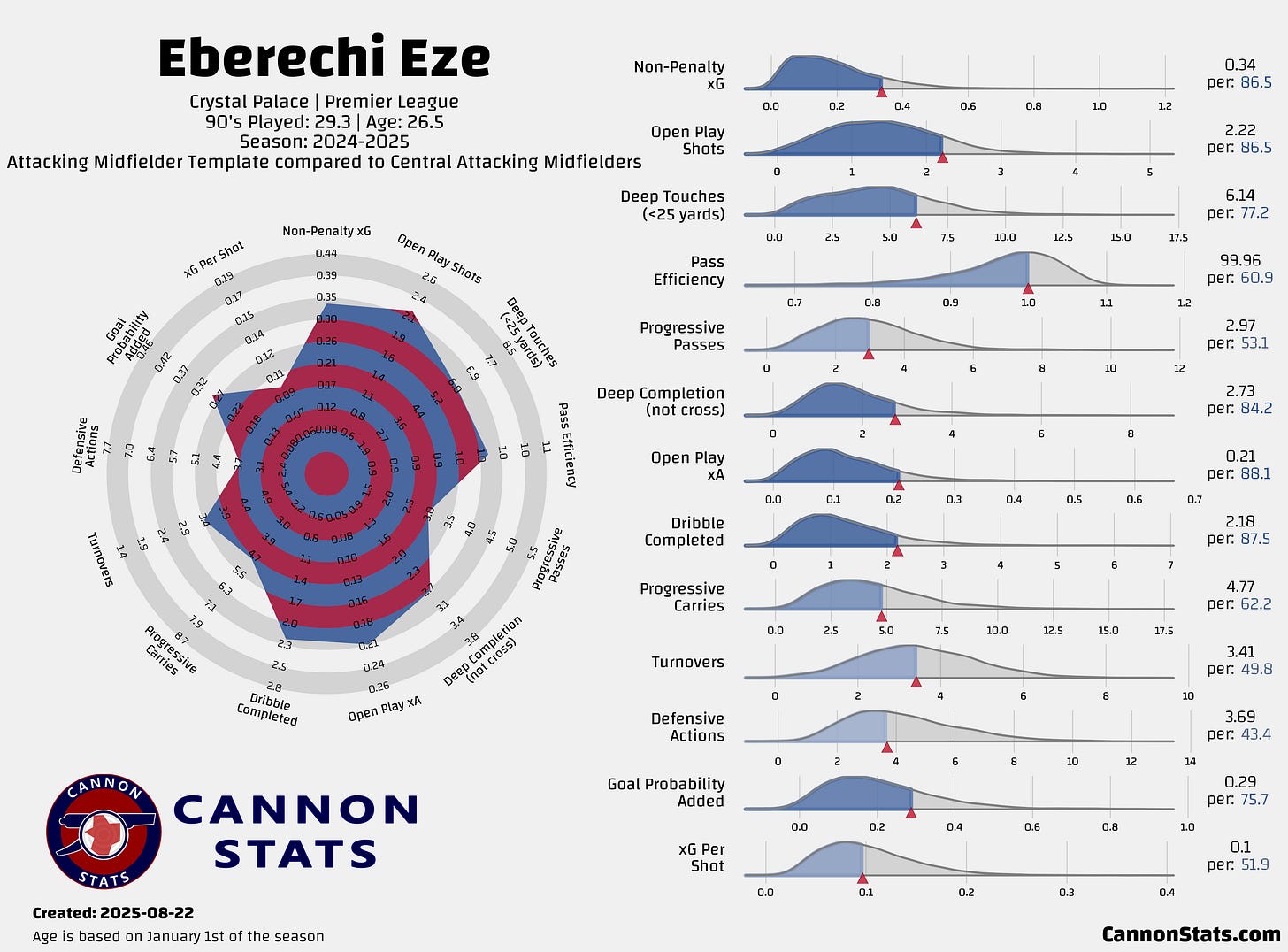 Eze in a Crystal Palace side didn’t get a ton of passes like he might in a team like Arsenal that has more of the ball but he was still one of their higher usage players, especially in the final third. His overall passing volume is a bit below average (40th percentile) but his final third usage was high for his team (nearly 80th percentile).