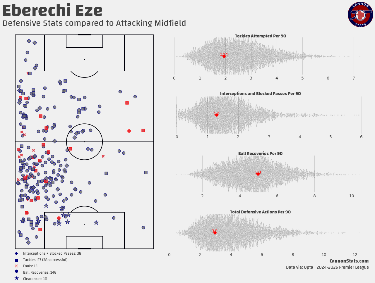 Given Eze’s attacking importance to Crystal Palace, he gets a bit of a break on needing to win the ball back. He still contributes to this but he isn’t going to be confused with a ball winning monster and that’s not uncommon for a player that has his role in a squad. There is nothing here that would make me concerned that he doesn’t do enough work off of the ball out of possession.