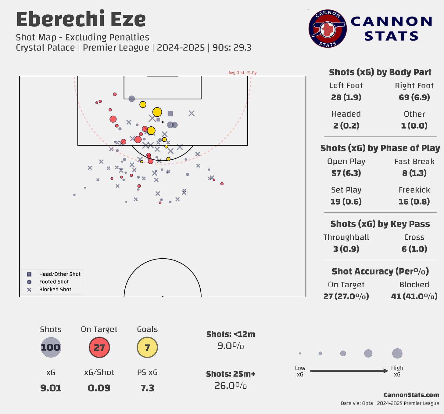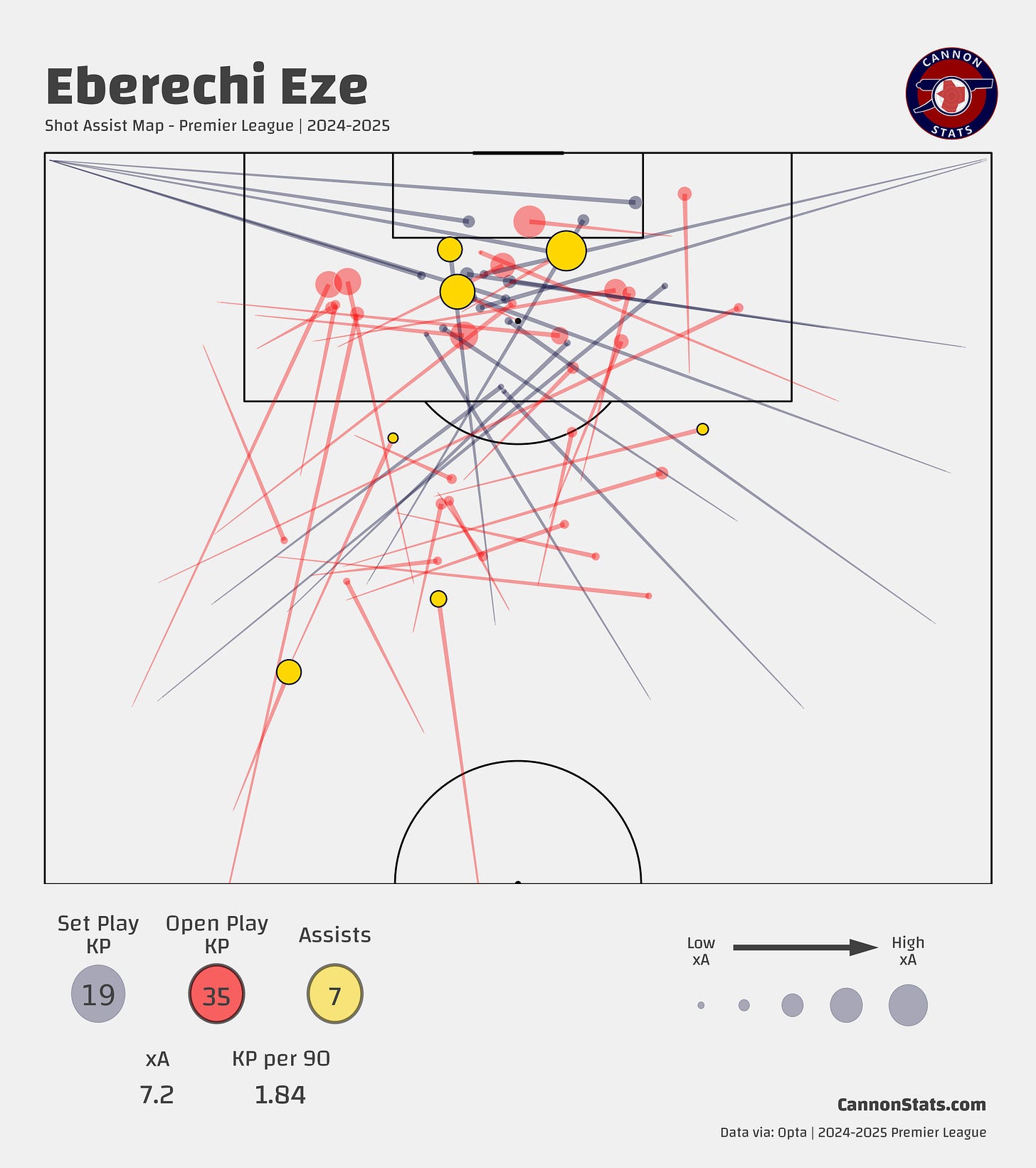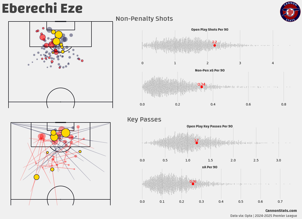 Eze’s shooting is about getting that volume. Last season he took 100 shots and that would have been plenty to see him as the clear leader at Arsenal where Leandro Trossard led the team with 72. On a per 90 basis he would have been right there with Bukayo Saka (3.44) with his 3.47 shots per 90.