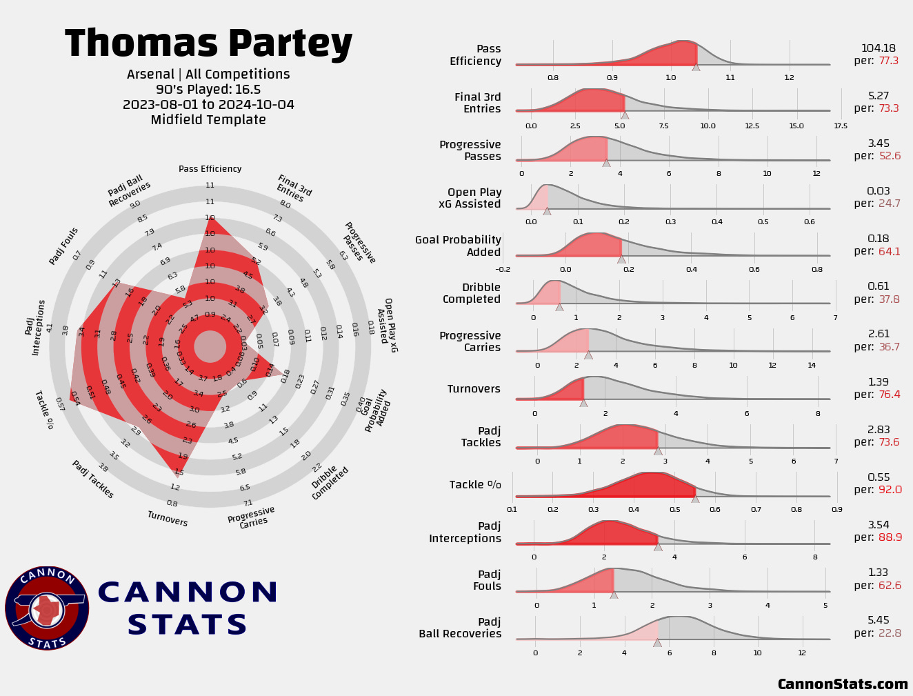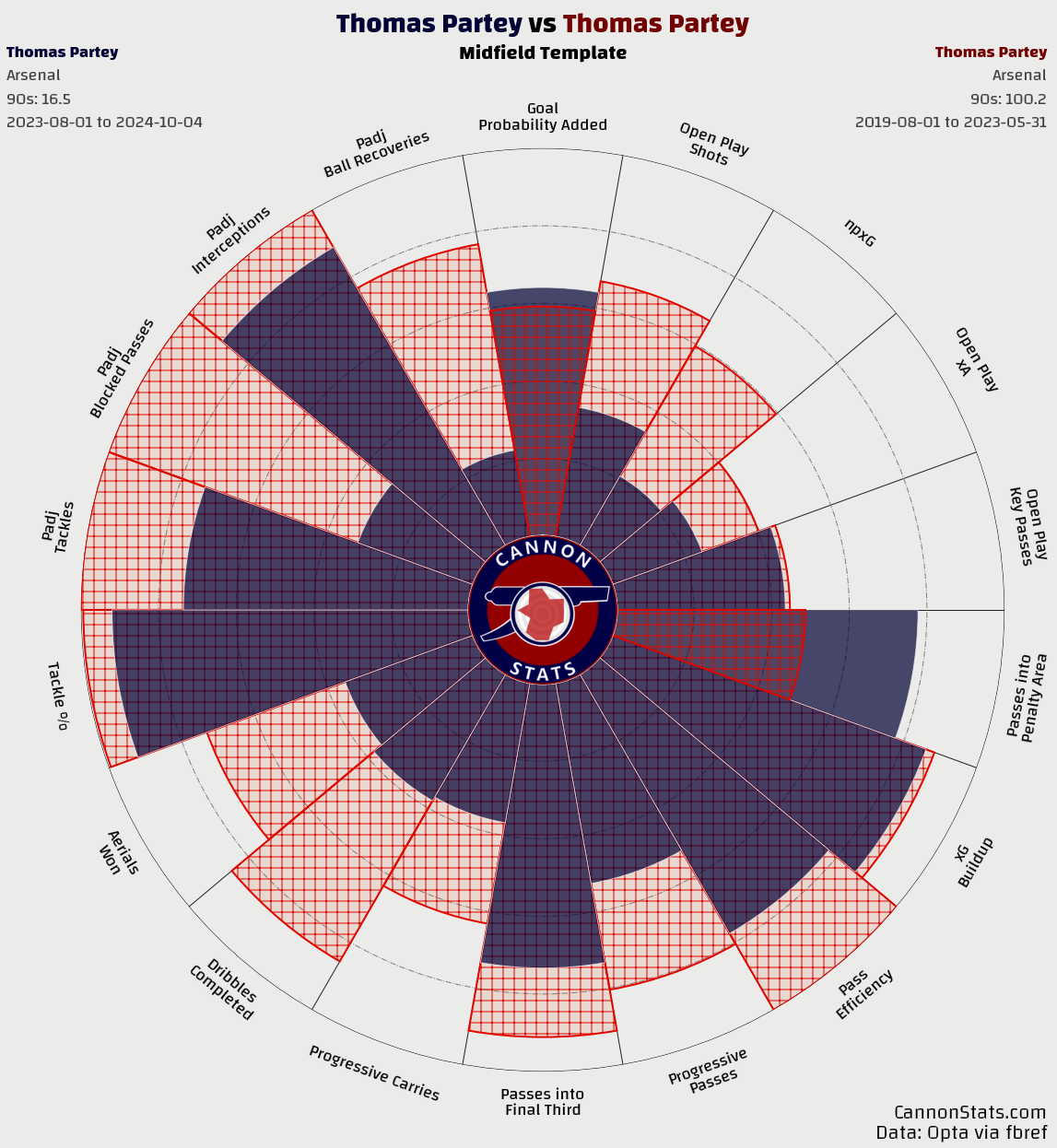 This isn’t bad but I am not sure it screams out to be a player that is in need of an extension or that cannot be replace, and better yet improved upon. Compared to the Partey at his peak this looks like a shell of his former production. The graph below has his 2019-2023 seasons in red and his last two seasons in blue.