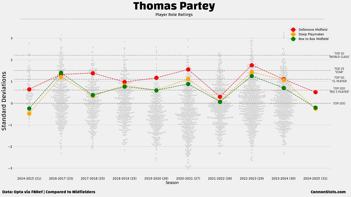 His time at Atletico Madrid was good but he was never a TOP TOP player, rating out as a solid Champions Legue caliber player. After moving to Arsenal his first season saw him go up a level with a bigger role, his 2021/22 season was hit by injury and he didn’t quite live up the same level but bounced back strong the next year as Arsenal had a title challenge.