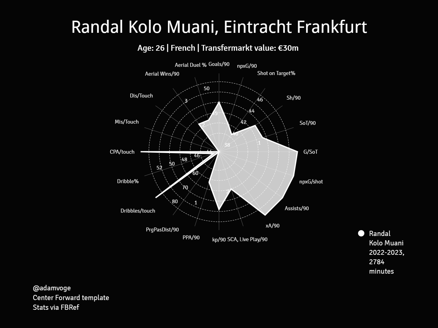 He did well at Frankfurt to find good shooting opportunities and generally executed his finishing well. You wouldn’t call him the most prolific shooter or scorer, but he made up for that by providing good creativity for a frontman, and lots of threat via his carrying. He was also quite useful in the air, where his 6’2” stature came in handy. The big negative here, though he is a direct player, is the turnover section in the top-left, where he did pretty poorly.