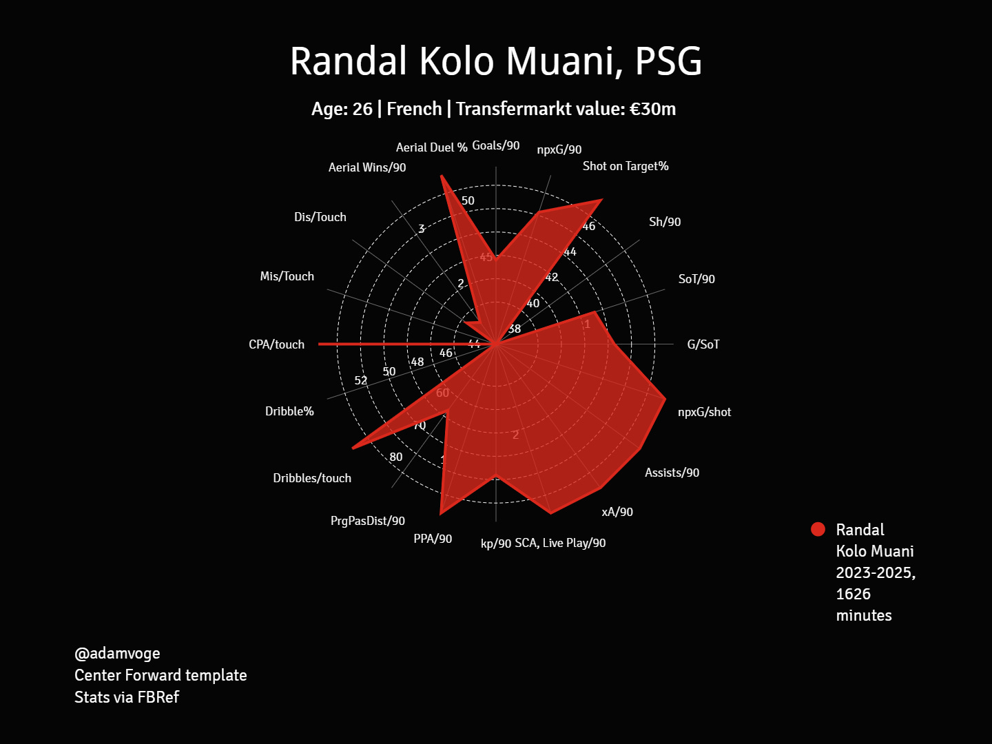 The month is younger than young, but one of the most prominent attacking names (non-Rashford division) that’s seemingly being shopped is PSG’s Randal Kolo Muani, who joined the Parisians for €75m plus add-ons in summer of 2023 but has so far failed to impress, compiling 13 non-penalty goal contributions in about 18 90s of league play. He’s also scored one goal in about 7 90s in the Champions League since joining the Ligue 1 juggernauts.
