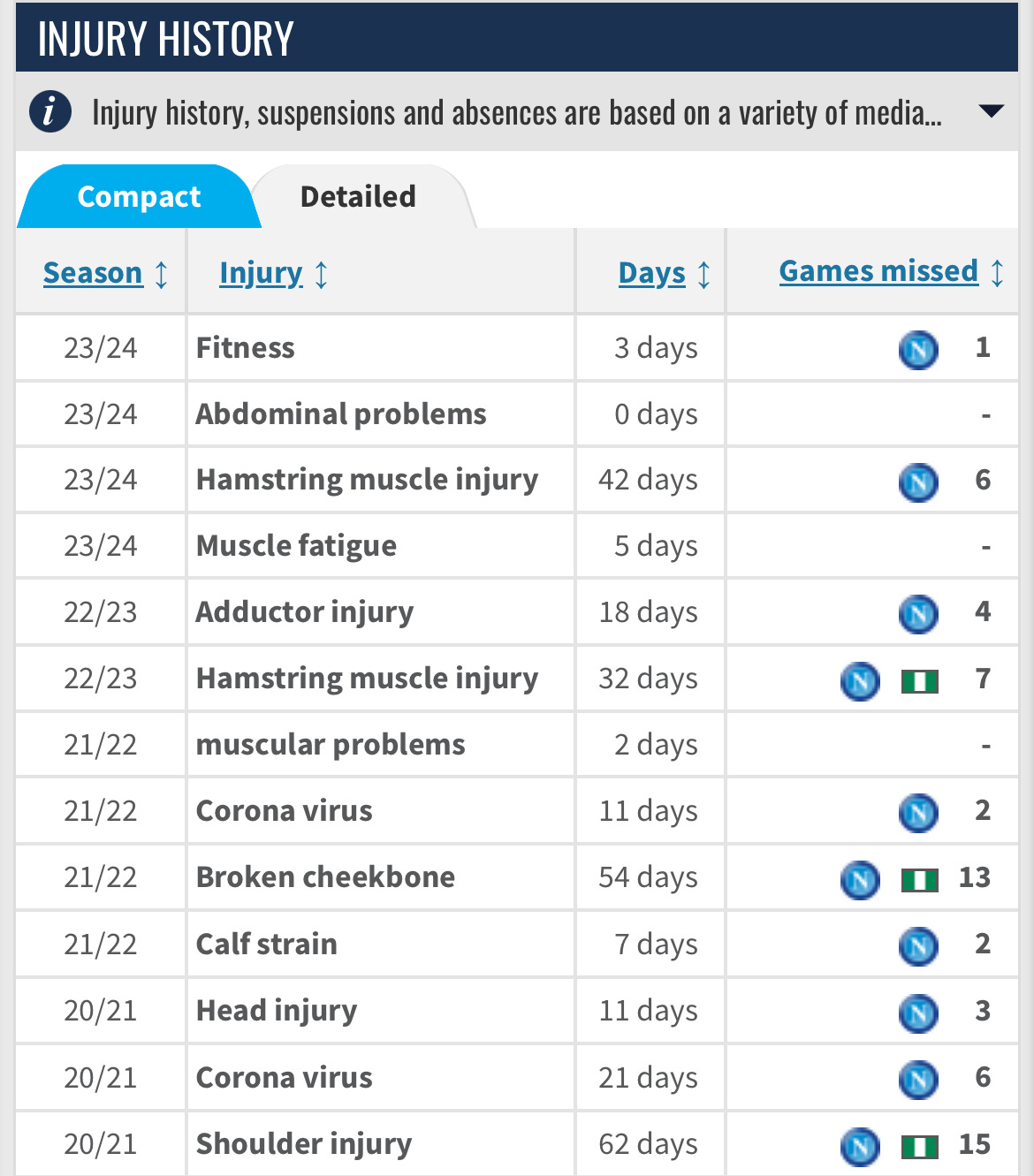 The biggest thing to flag about Osimhen is definitely his health. Transfermarkt estimates he’s missed about 35 matches for club and country since moving to Napoli in 2020. Some are muscular, which is what you really worry about, while others are more clearly anomalies, like catching COVID or literally breaking his face.