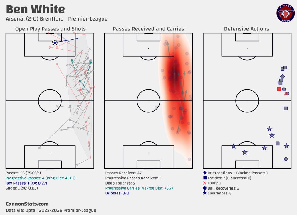 White was back to his best Wednesday against Brentford, surfacing among Arsenal’s leaders in progression, staying stout at the back and providing a gorgeously chipped cross to Mikel Merino’s crown for the opening goal.