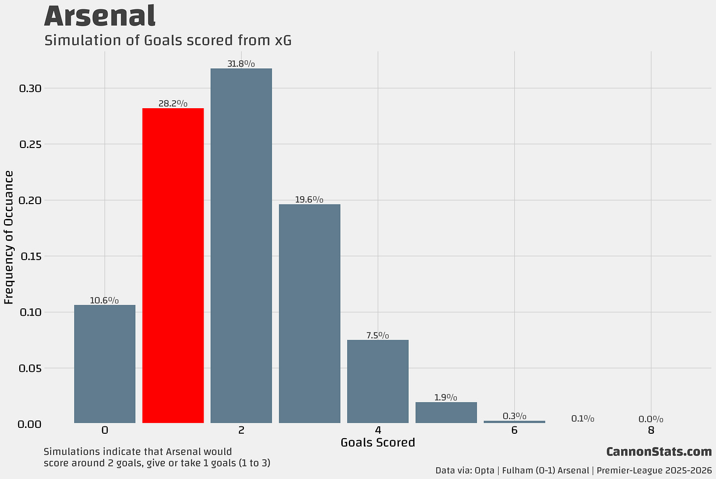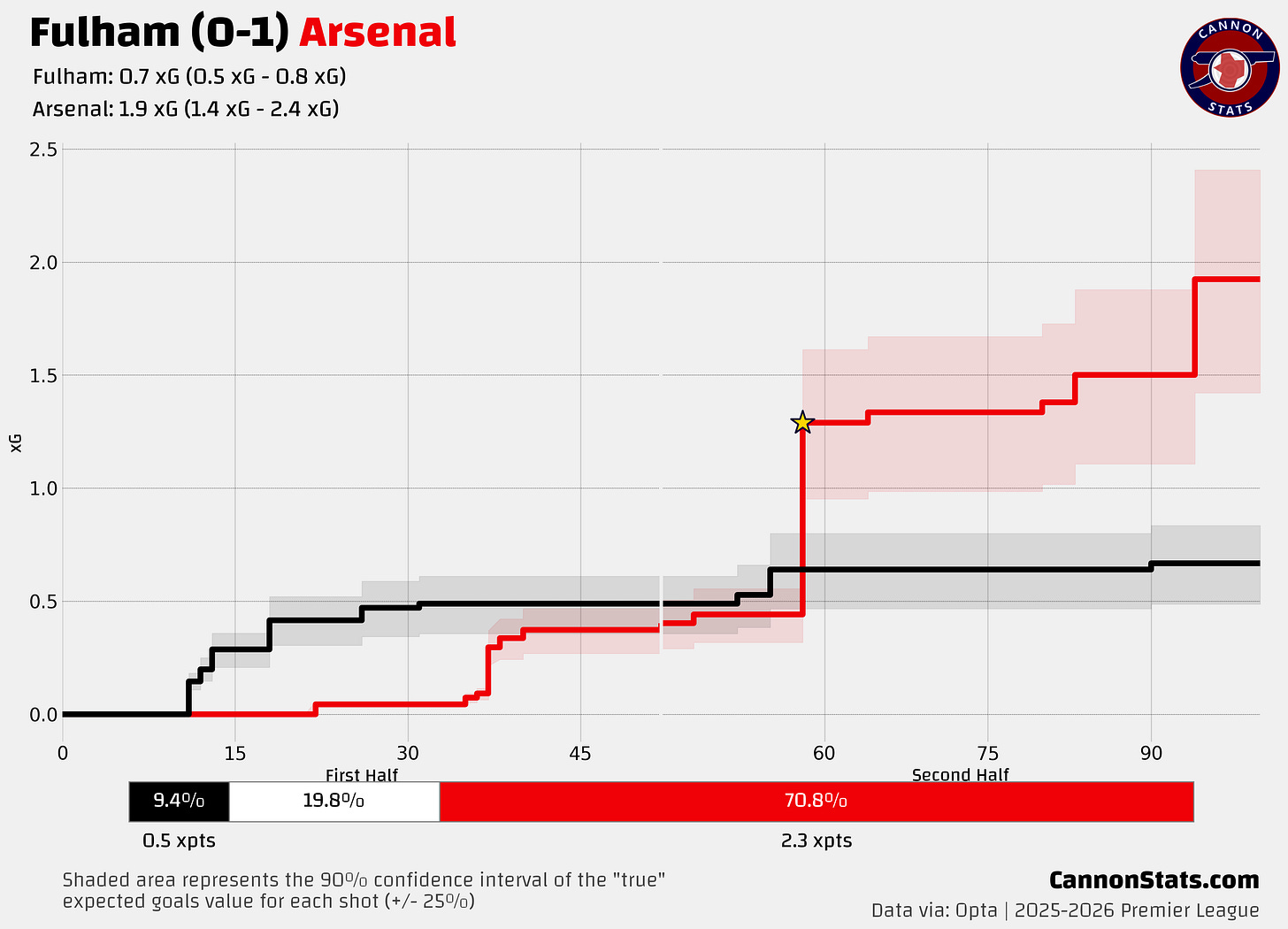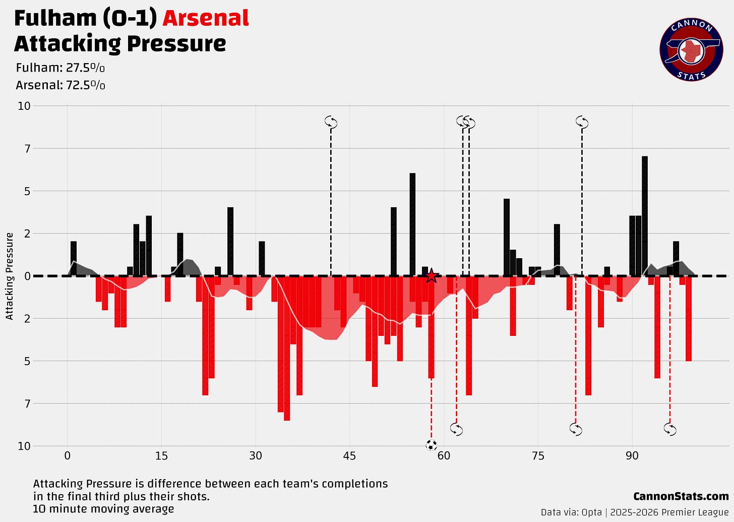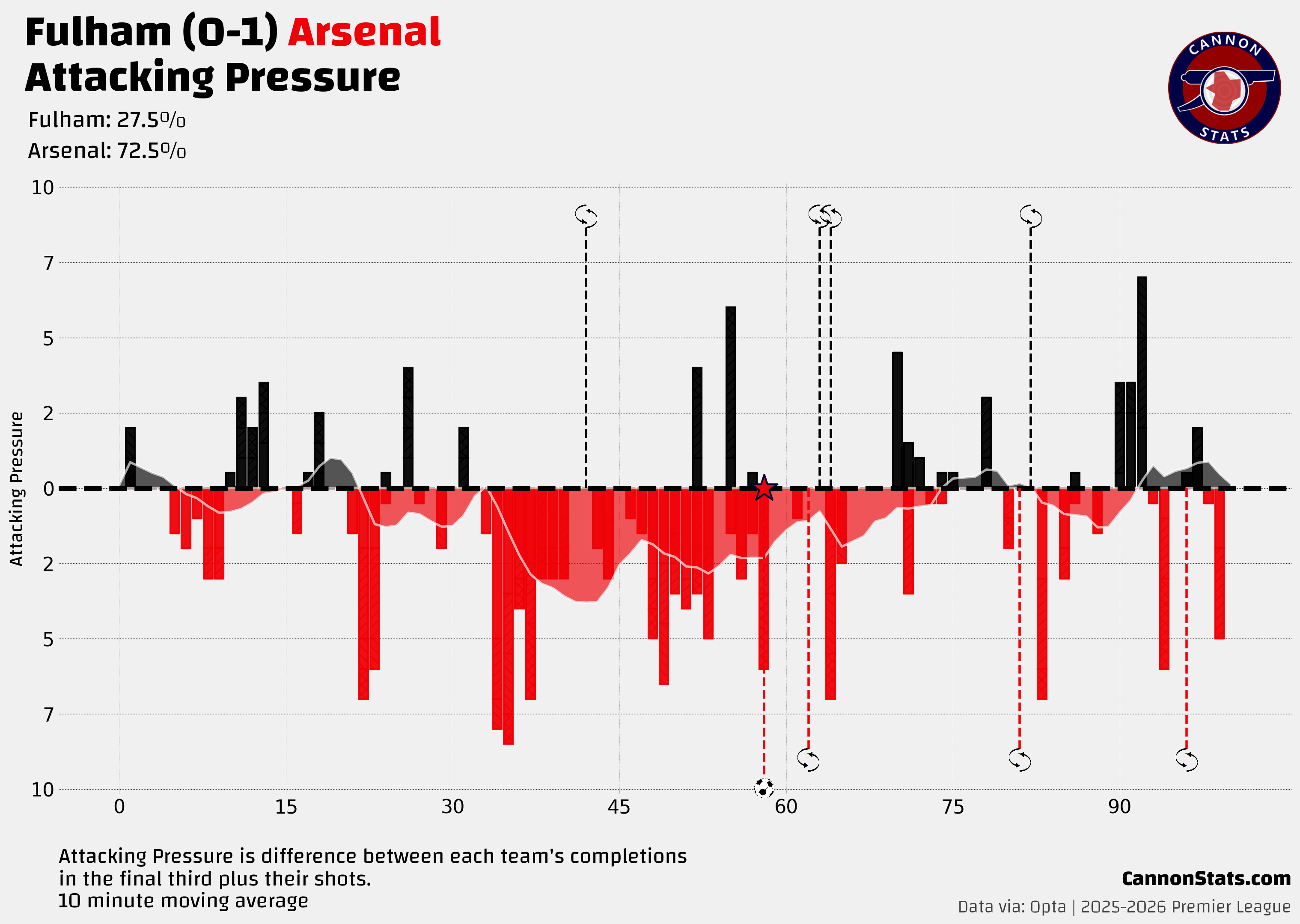 This was a match that was a bit shaky to start (as things often are after an international break) but Arsenal grew into the game. The attacking pressure graphic I think is a good view of this match. Really showing the overall flow, where Fulham had some good chances early in the match and then it swung pretty heavily to Arsenal.