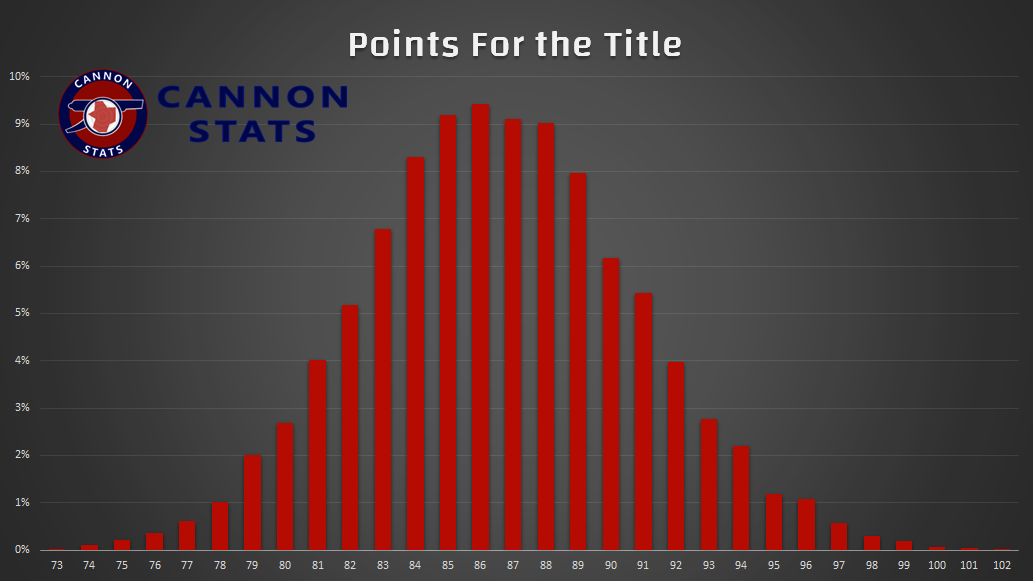 At 88 points, that total is projected to win the title about two-thirds of the time, an additional point pushes the times that wins the title to three-quarters.