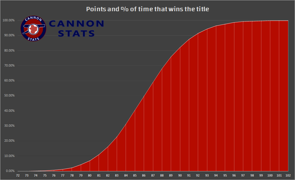 85 points is the title-winning tally 9% of the time but that point total only wins the title about 40% of the time. 86 points is a bit better going to just under 50% of the time.