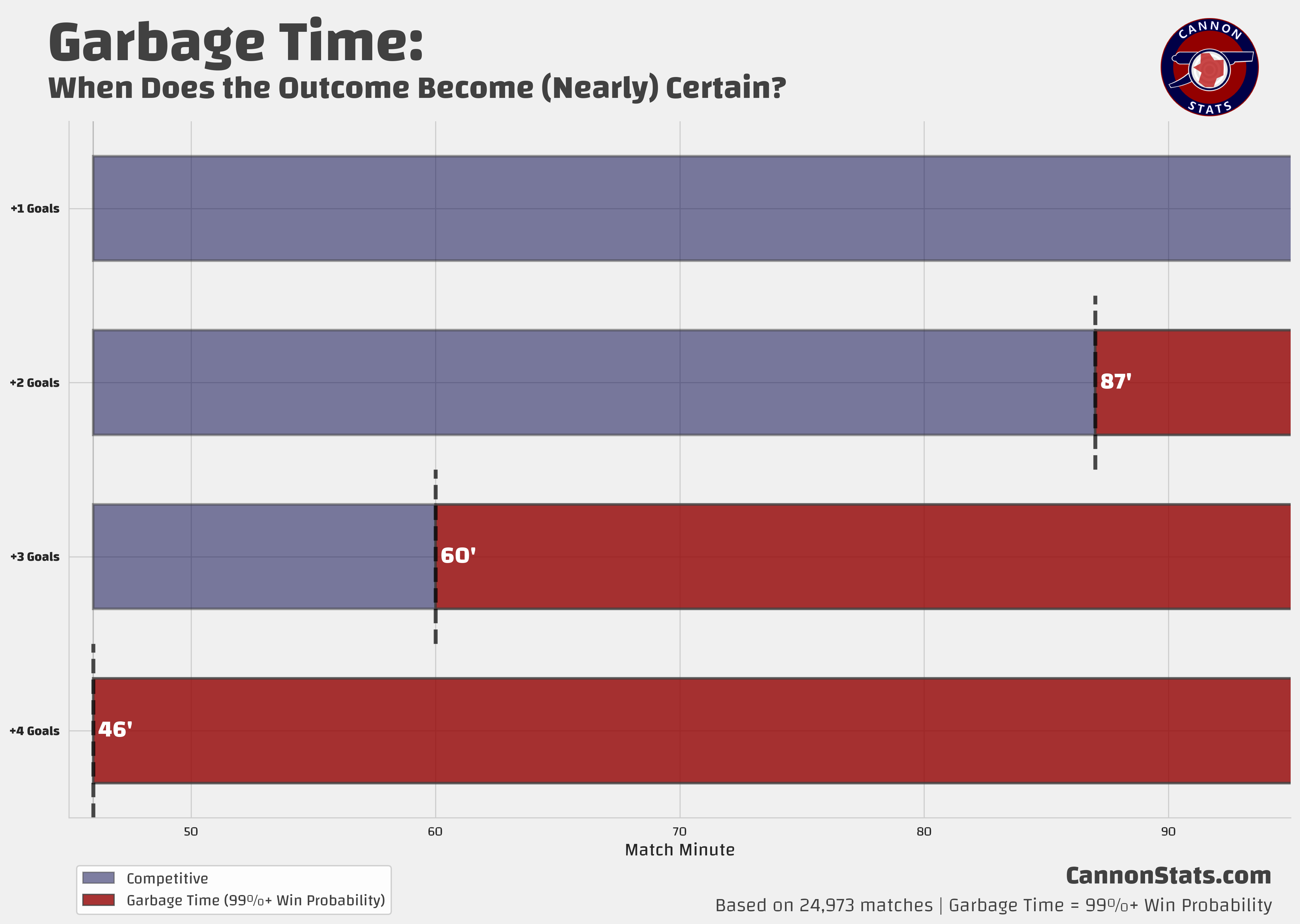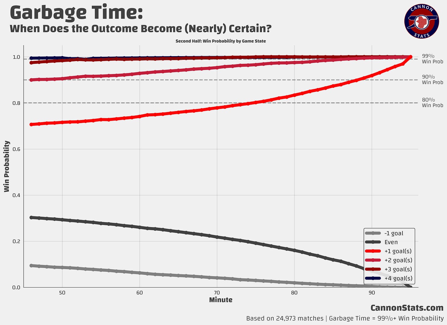 The Cannon Stats Definition: Garbage time occurs when a team’s win probability reaches 99% or higher in the second half. At this threshold, the match outcome is all but statistically certain, even though play continues.
