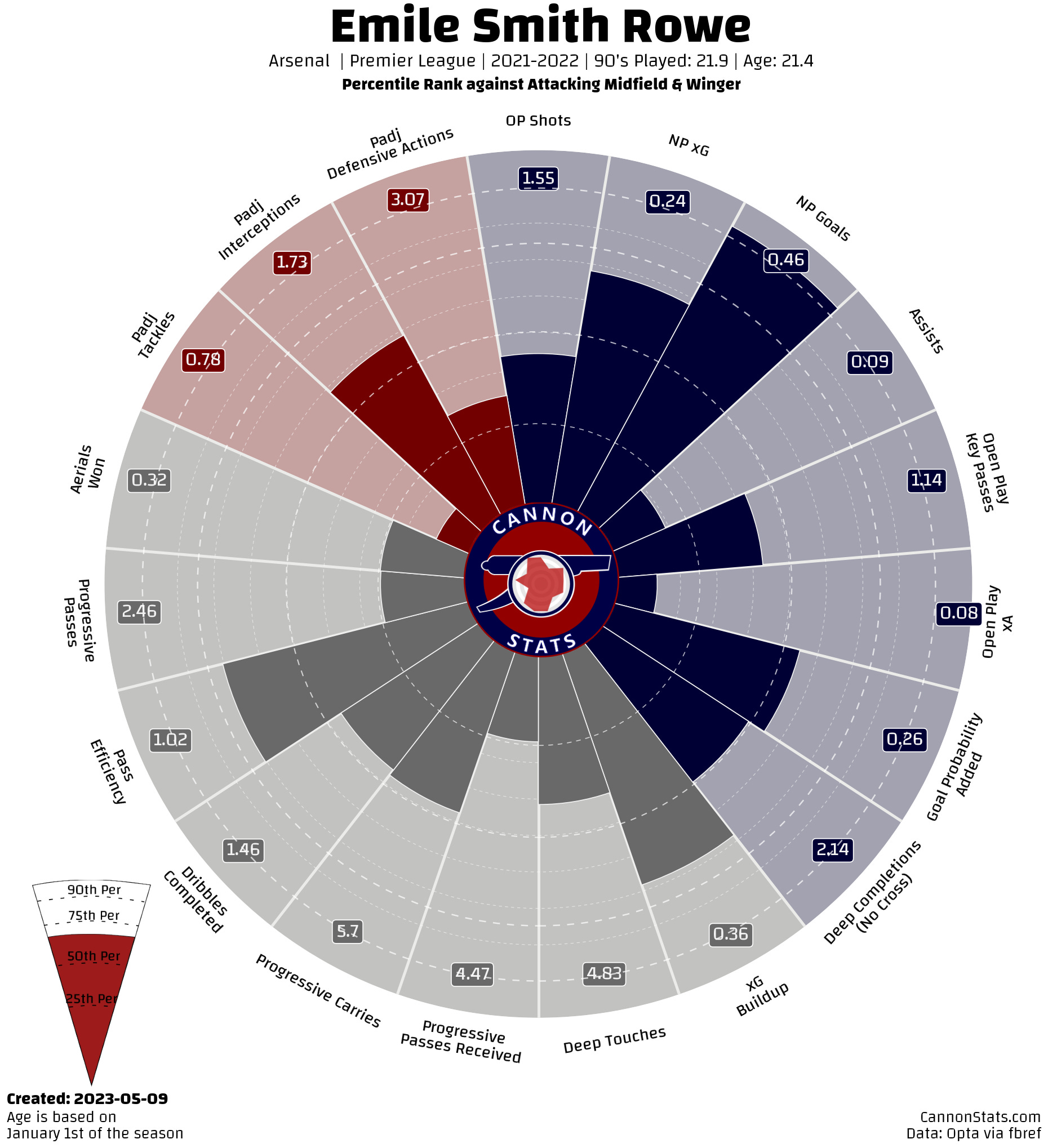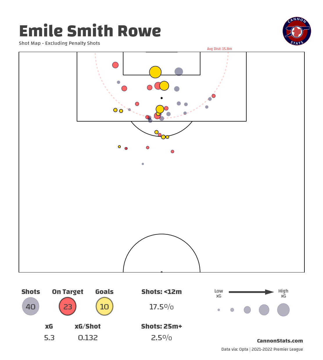 Smith Rowe scored ten goals last season but it was from nearly double his xG (from my model, Opta has him at 6.0 and 5.6 from StatsBomb). The majority of his shots come from good locations but he doesn’t have a massive amount of ‘big’ chances with lots of chances with medium quality and a few goals from long range.