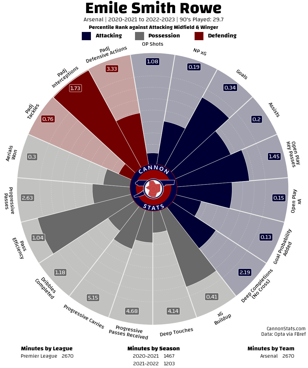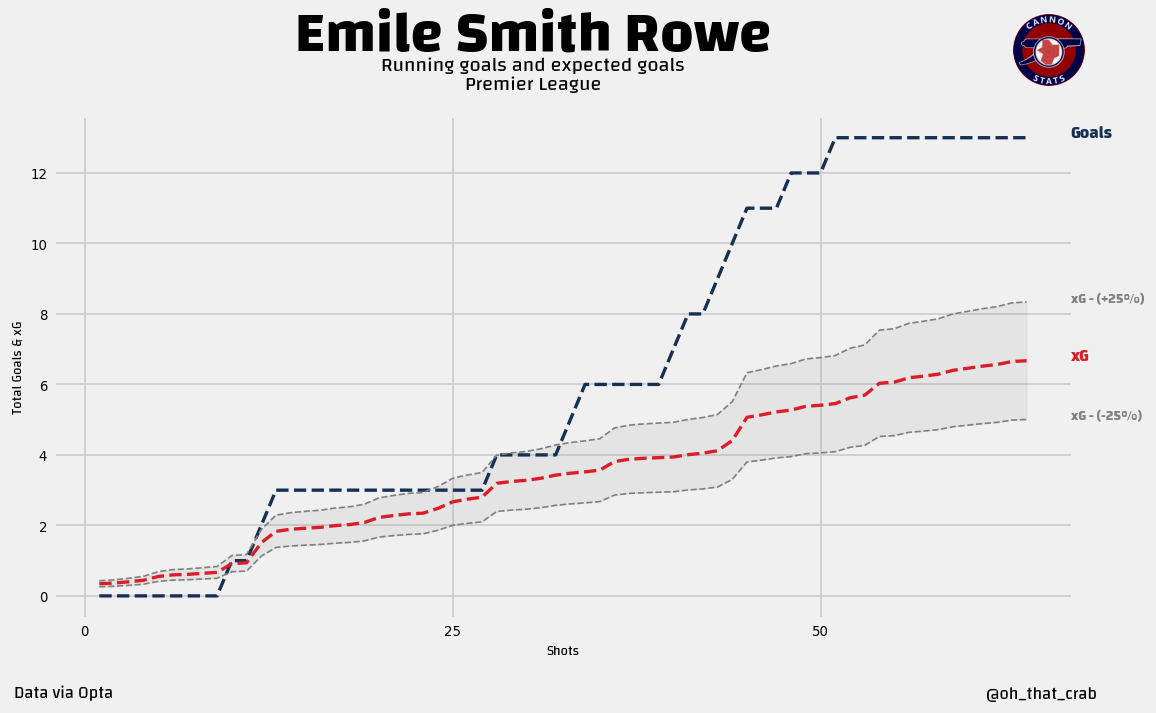 For his Arsenal career, he is well above his xG of just below 7, scoring 13 goals. It is possible that Smith Rowe is an amazing finisher but with less than 100 shots in his sample it is really hard to say with a lot of confidence that we should expect this to continue, and should probably not expect him to be over 40% above his expected goals going forward.