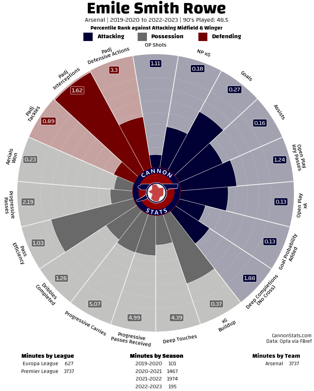 Looking at a longer-term horizon going back to 2019-20 with Arsenal in all competitions it is even less impressive with most of his metrics landing around the median for attacking midfielders.