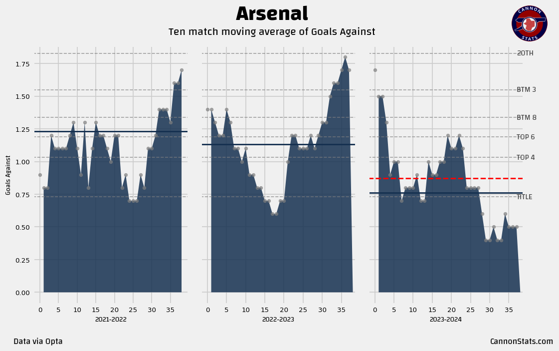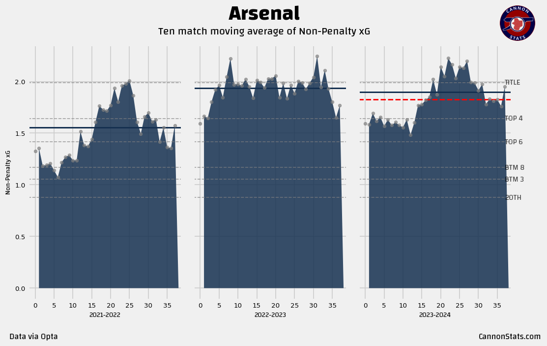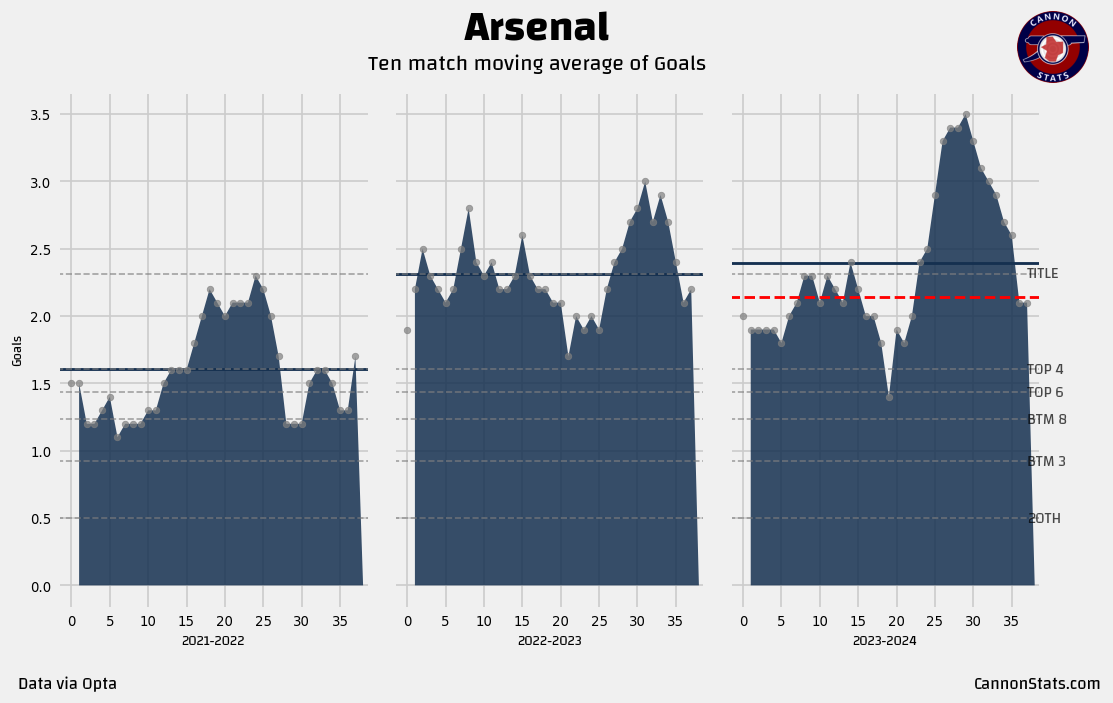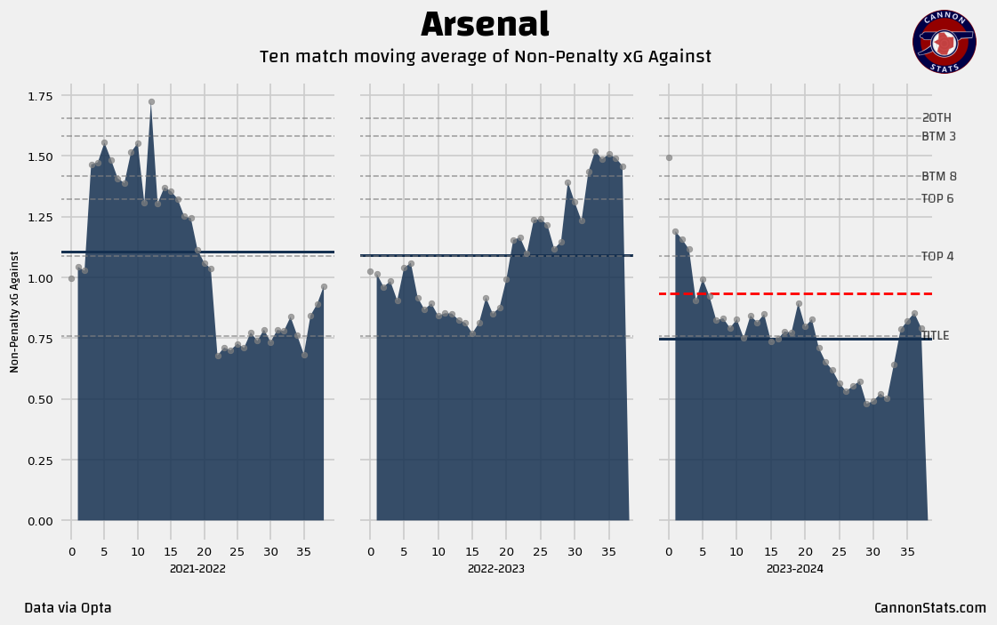 Goals Allowed: The average for 1st place is 0.73 non-penalty goals allowed, that's 28 goals. I was concerned about the target last season, but Arsenal hit it and had one of the best defensive seasons I have ever seen from them. Last season’s target was 0.83 non-penalty goals allowed.