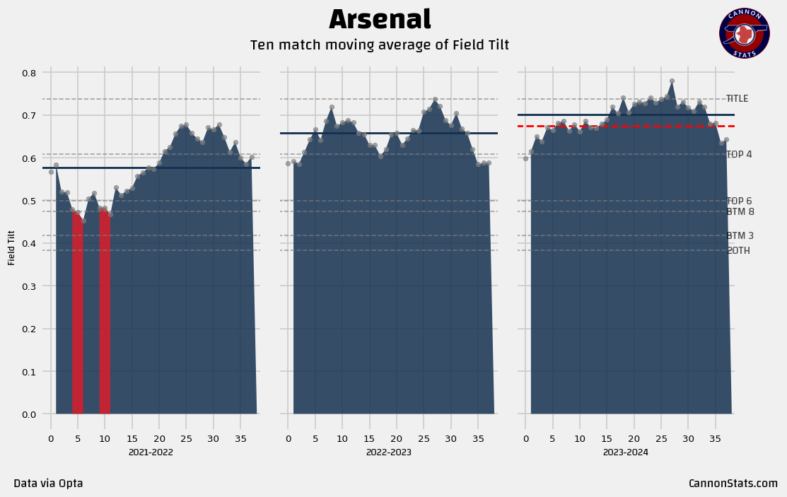 Field Tilt: The average for 1st place is 74% share of field tilt per match. Last season’s target was a 65% share of field tilt per match. It will be tough to squeeze much more out of this but we go again, Field Tilt FC till I die.