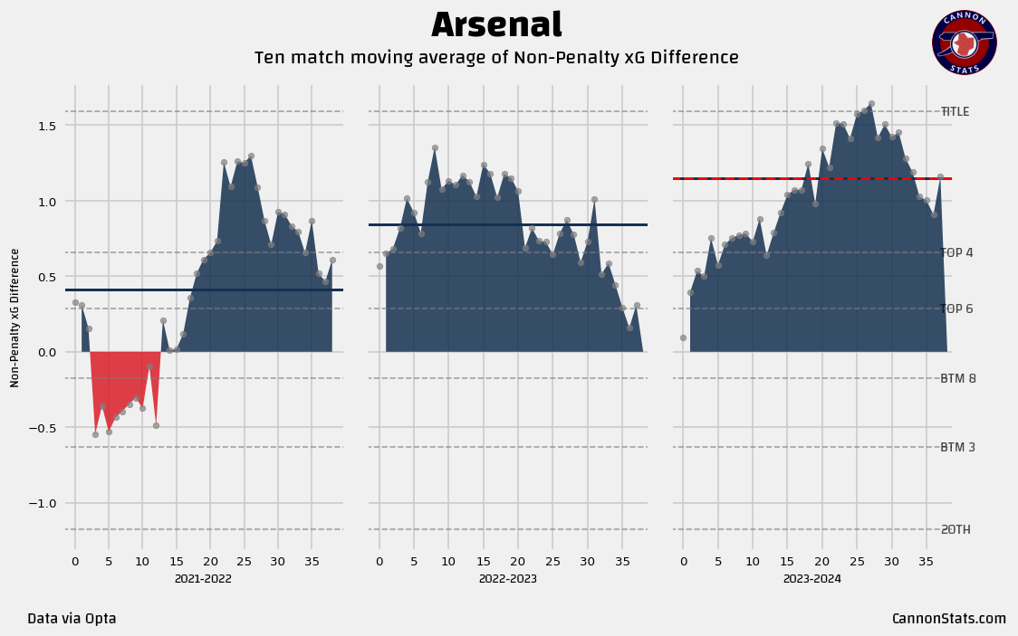 Expected Goal Difference: The average for 1st place is 1.23 non-penalty expected goals difference, that is plus 47 expected goals difference. Last season’s target was plus 42 overall, 1.1 non-penalty expected goals difference per match.