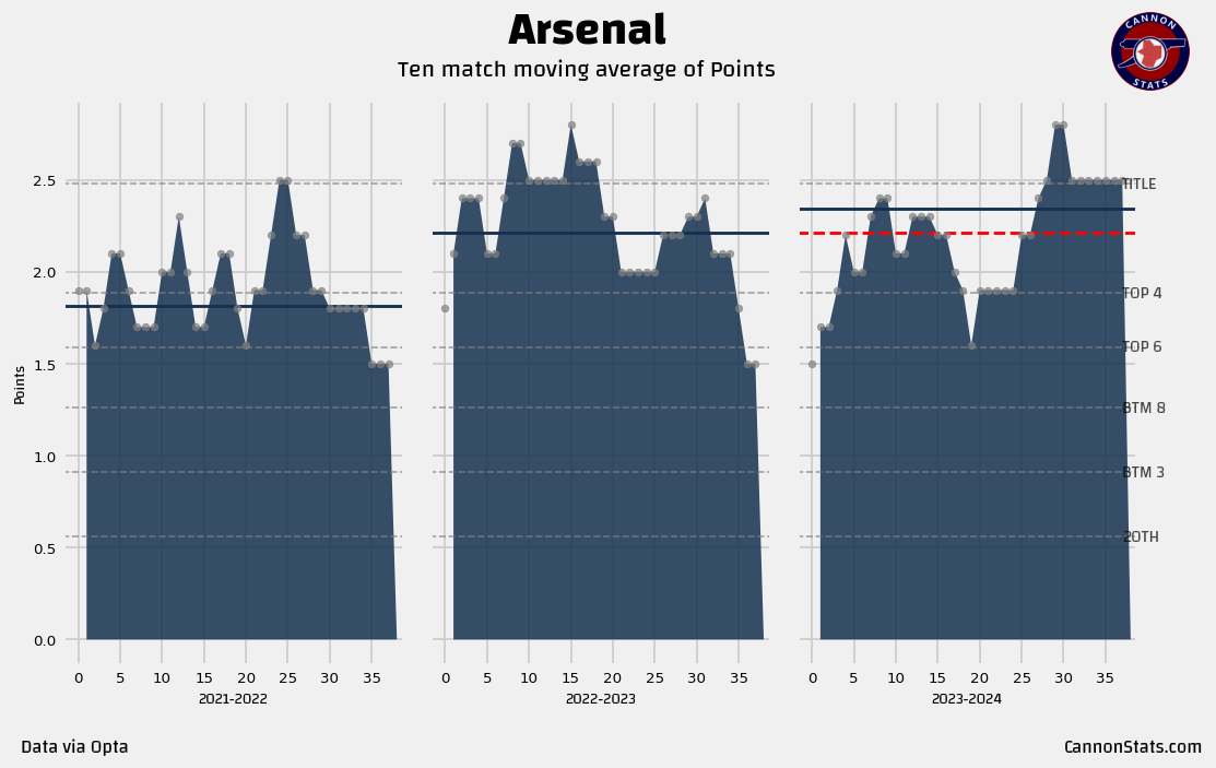 Points: The average for 1st place is 94.25 points 2.48 points per match. I am going to round down and say 94 points will be my expectation. That is a big number and one that will force Arsenal to get the best out of their team. Last season’s target was 2.29 points per match.