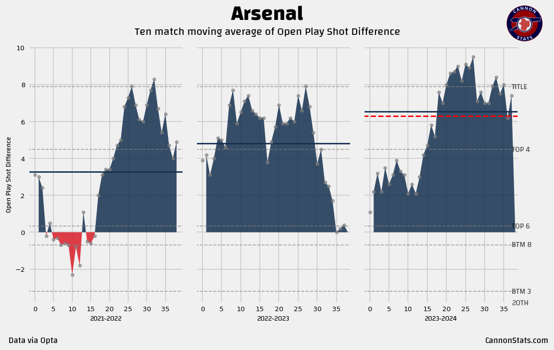 Open Play Shot Difference: The average for 1st place is 7.9 open play shots difference per match. Last season’s target was 6.1 per match.