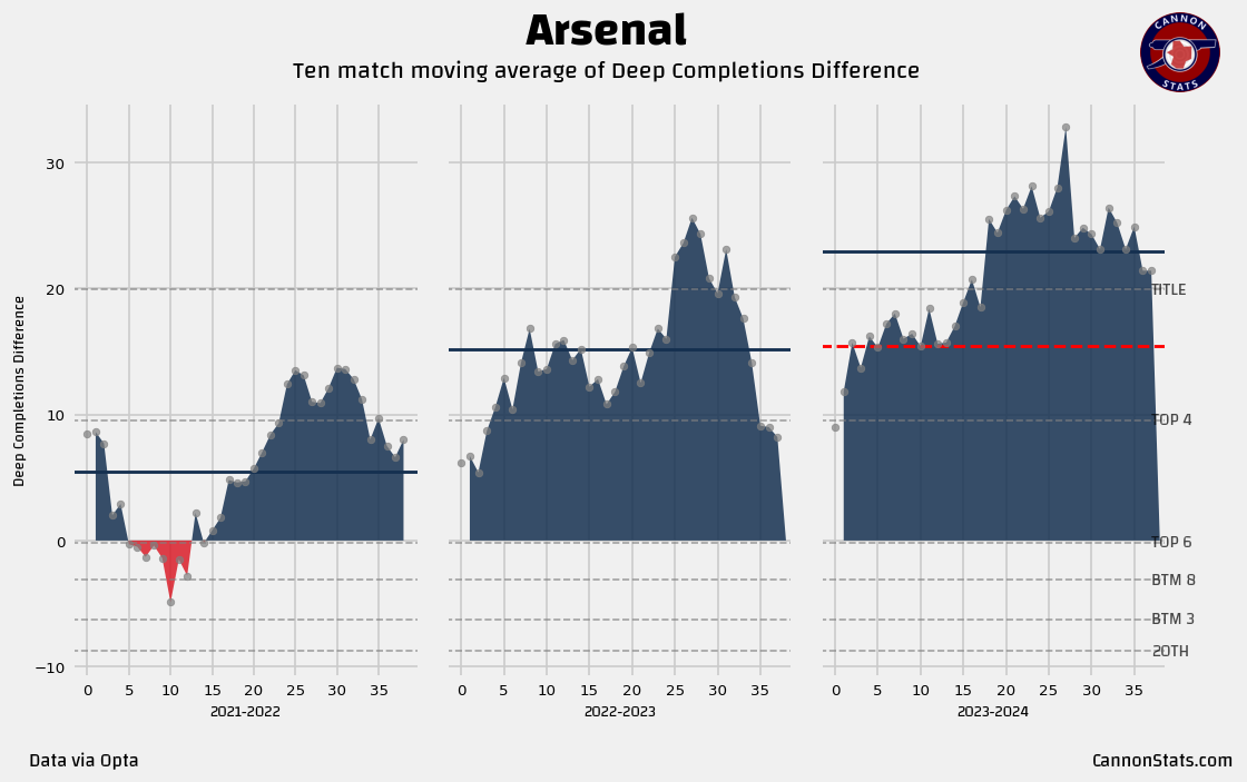 Deep Completion Difference: The average for 1st place is 19.9 Deep Completions difference per match. Last season’s target was 15.4 per match. Overall on deep completions, I feel confident that Arsenal can hit or most likely surpass this, the bigger question and problem was being more efficient from all of this.
