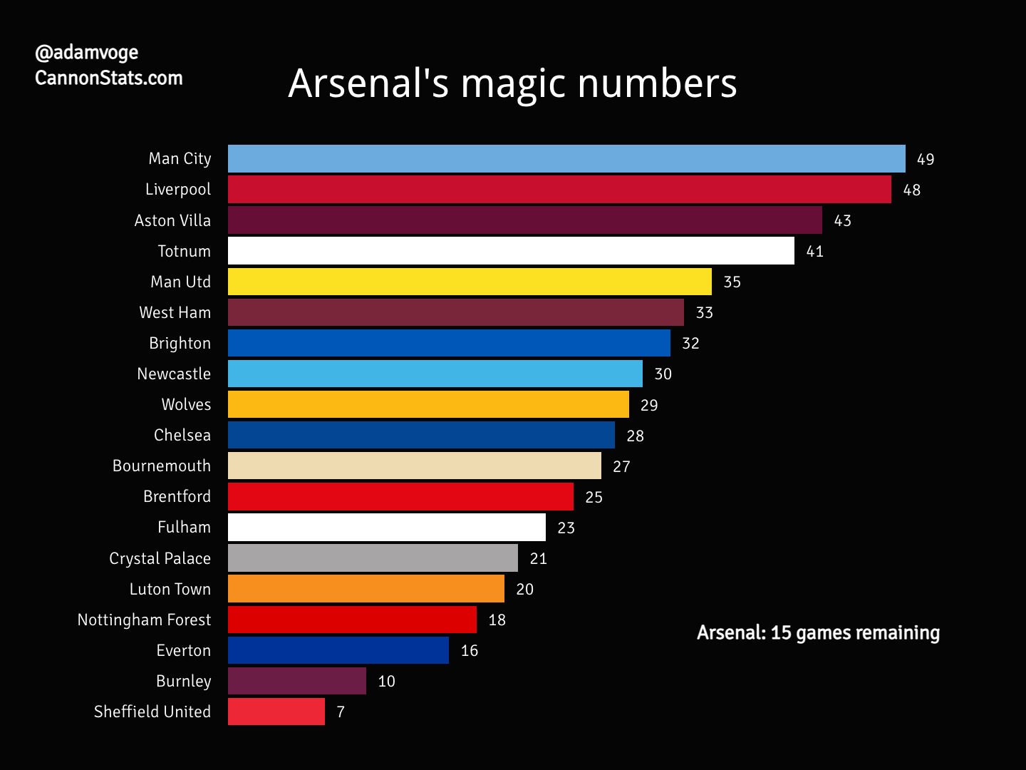 Magic Numbers is a sort of points differential measure. It takes into account not just points Arsenal can gain, but also points their opponents could lose. The number you see next to each other PL club, then, is the number of points needed to guarantee a finish ahead of them on points (Please note: I said ahead. Yes, Arsenal could finish level on points and ahead of these clubs. That’s not what I’m measuring here).