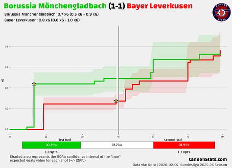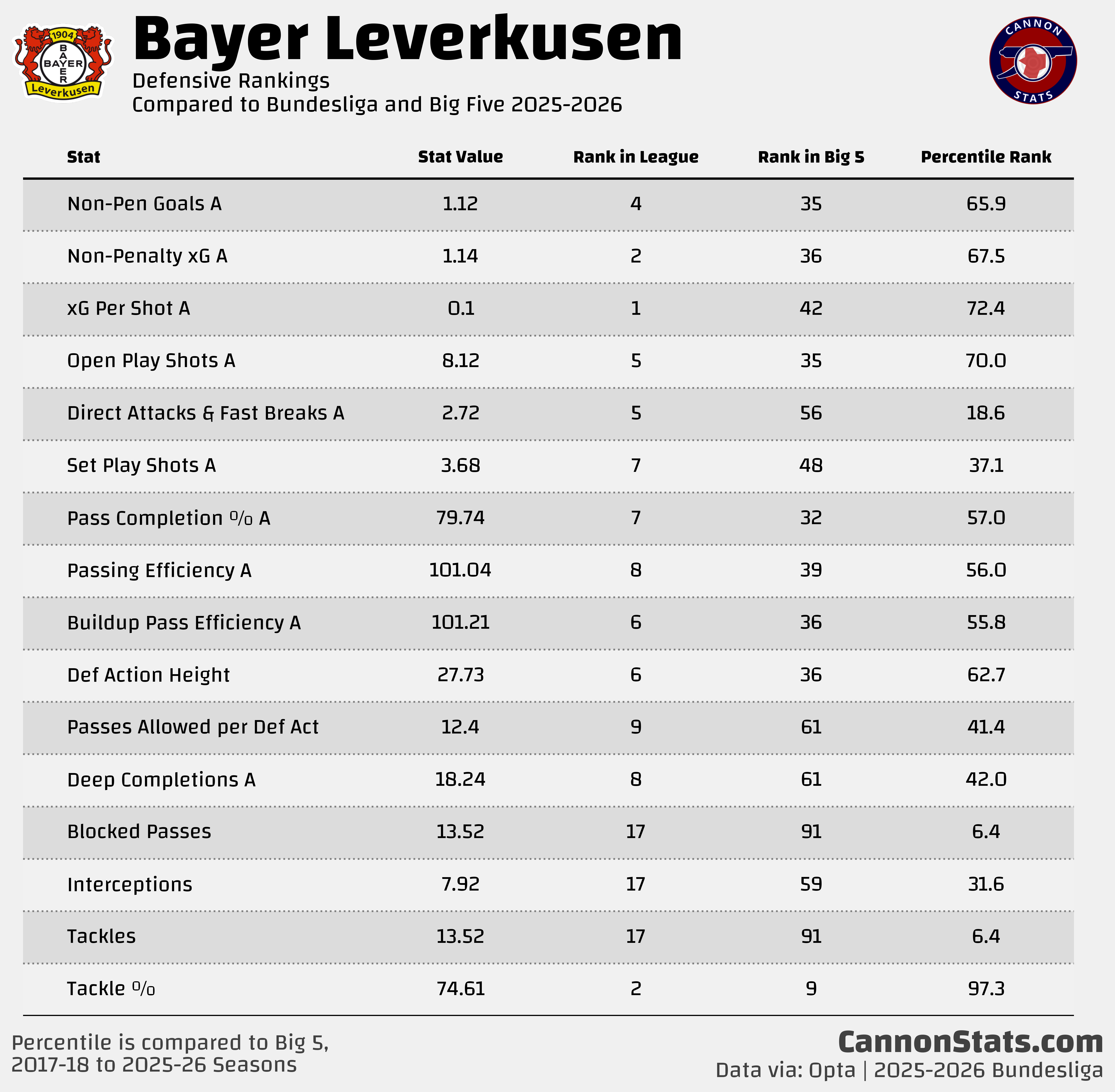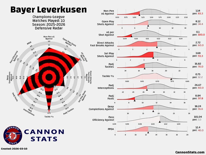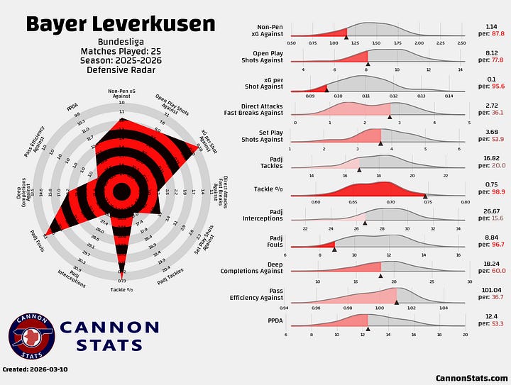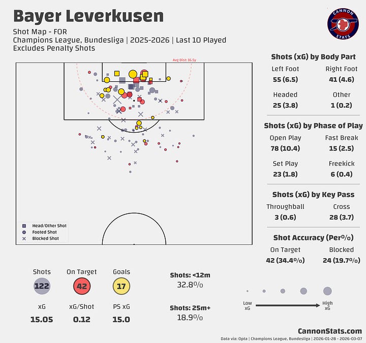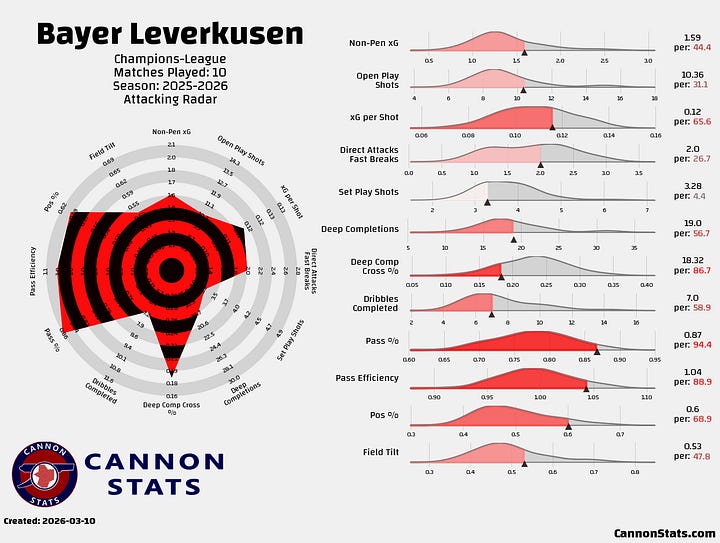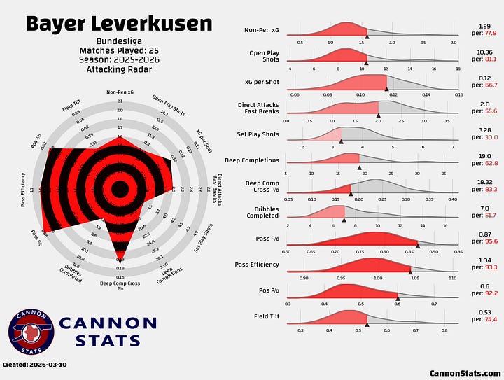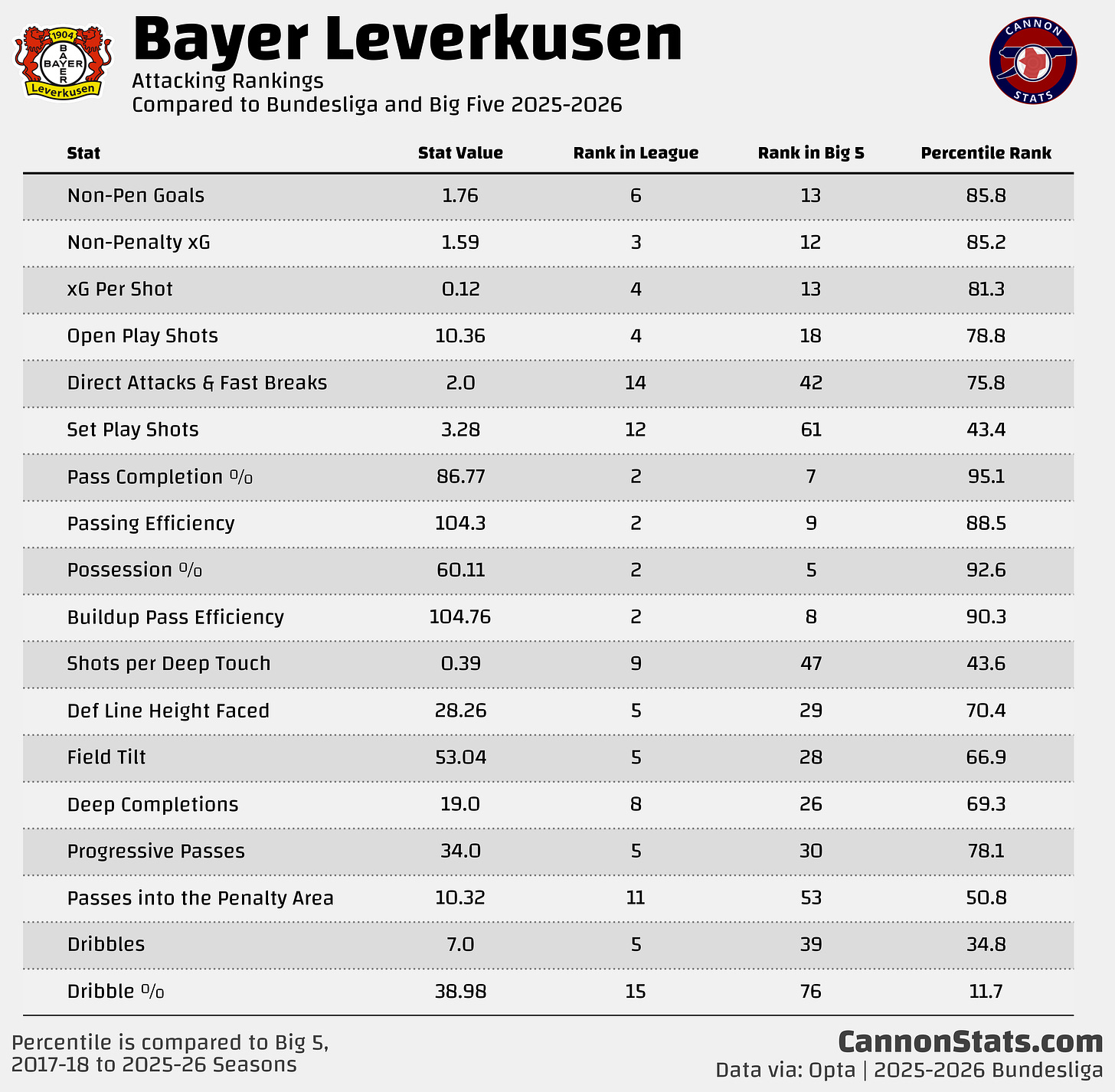Overall, as an attack, Leverkusen look decent but not elite. They are good at ball progression and hanging on to the ball but they don’t always translate that into dangerous moments.