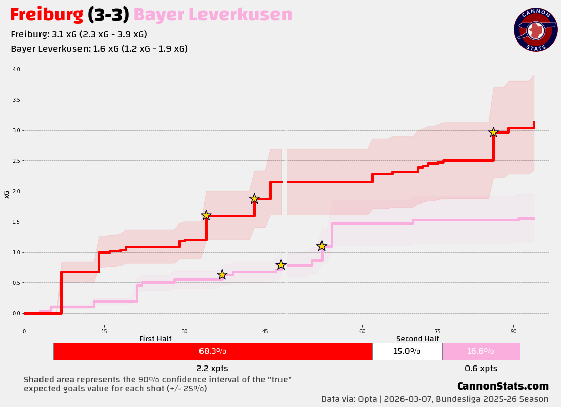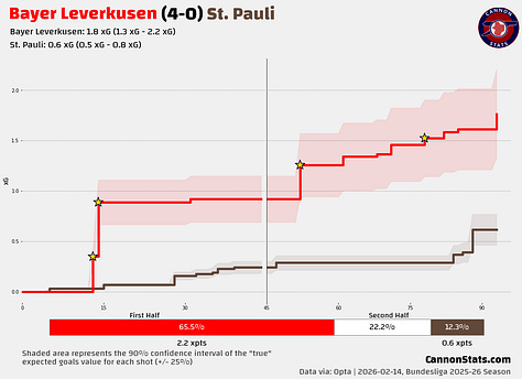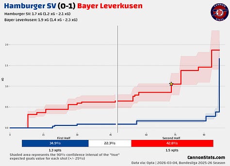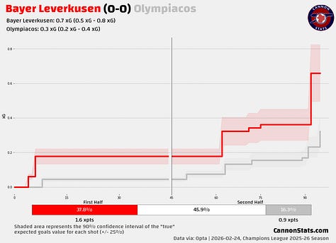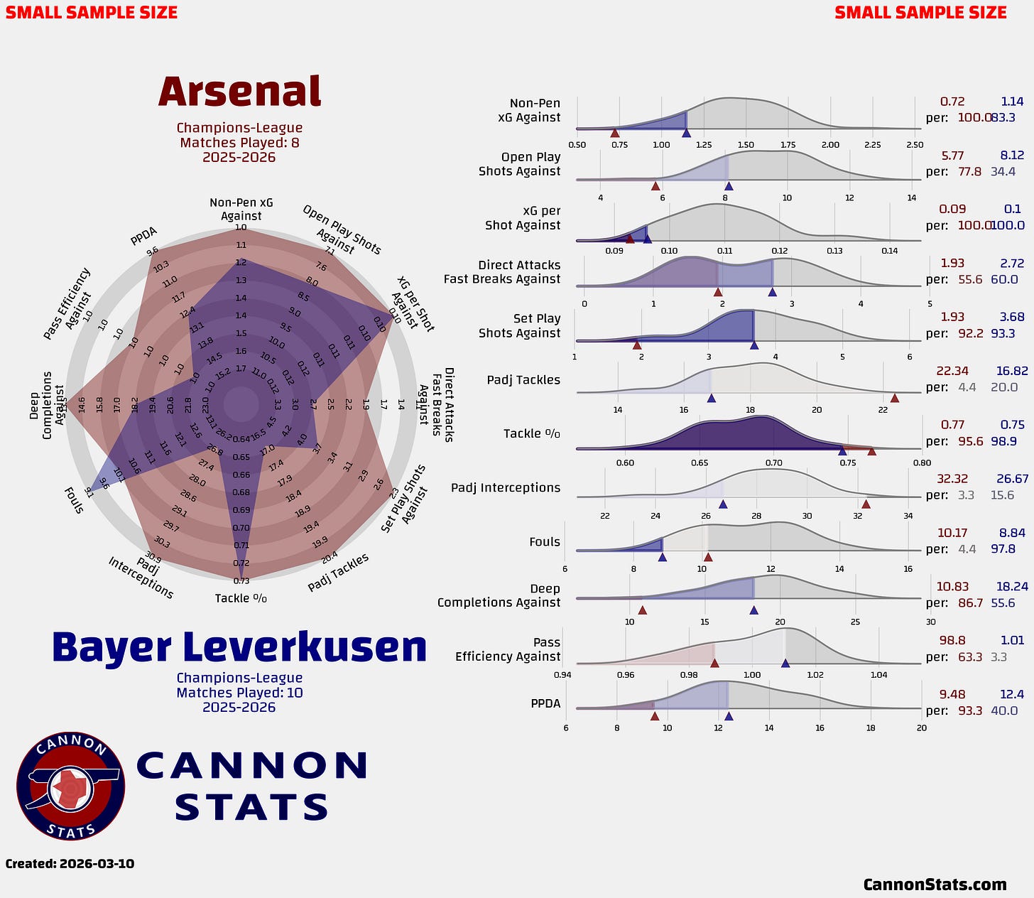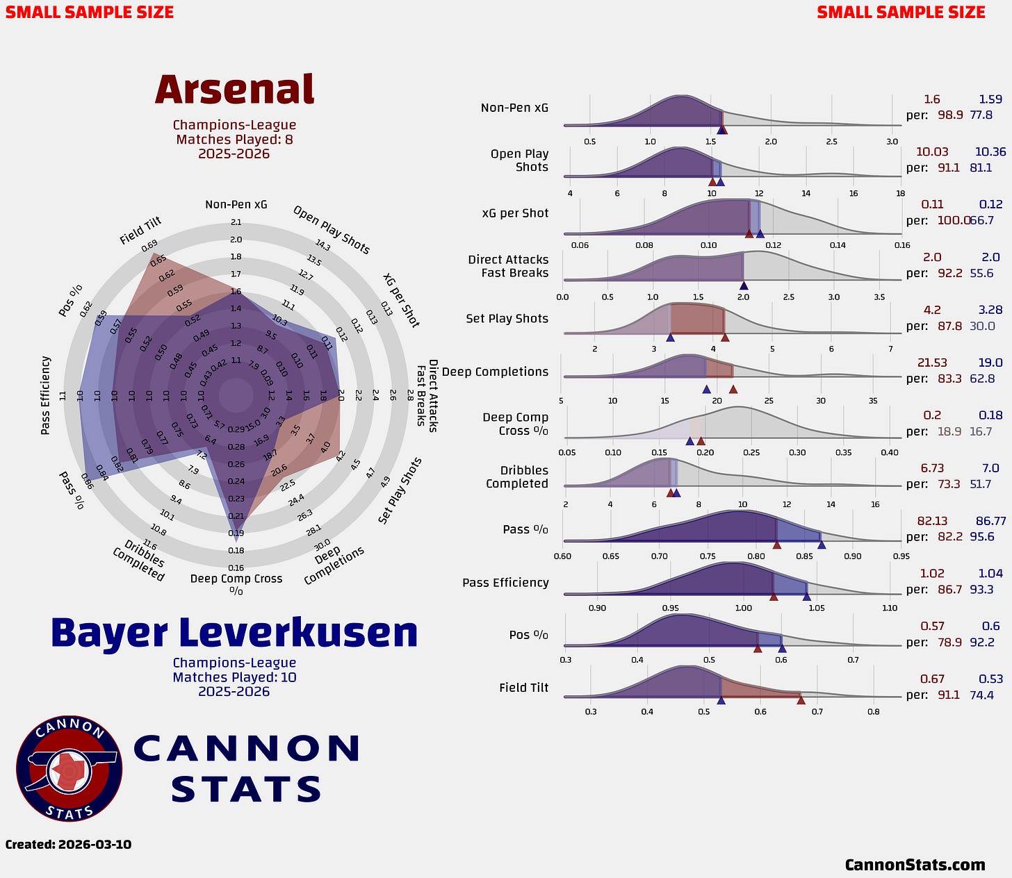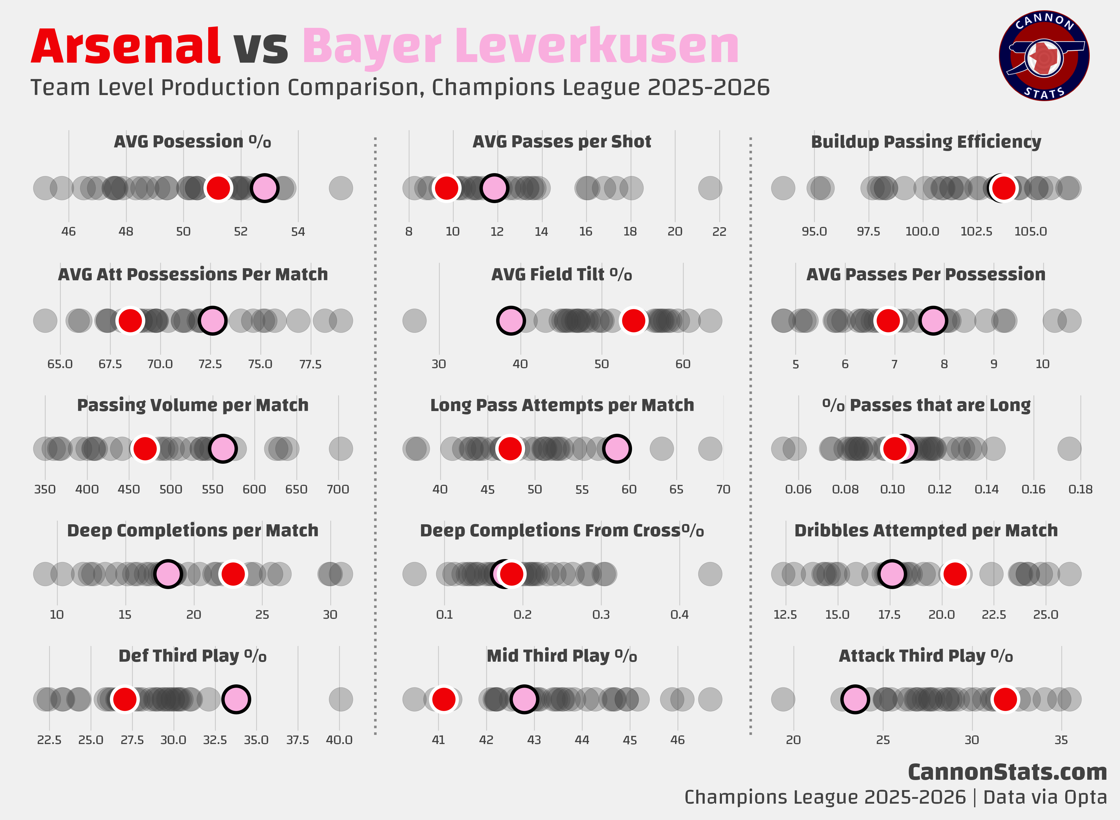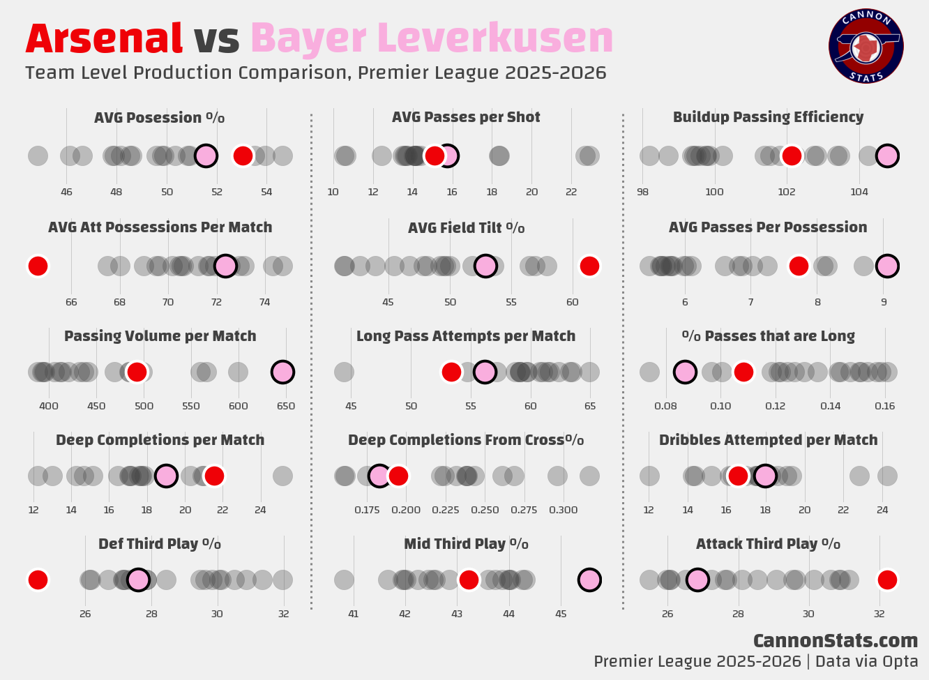 In the Champions League, Leverkusen still have more passes and more possession and that could potentially lead to a matchup where they do actually have more of the ball than Arsenal. For a “big” team, Arsenal are generally comfortable playing like this as well, believing in their ability to control the game through making it be played in the areas that they want it to.