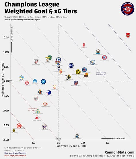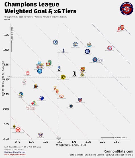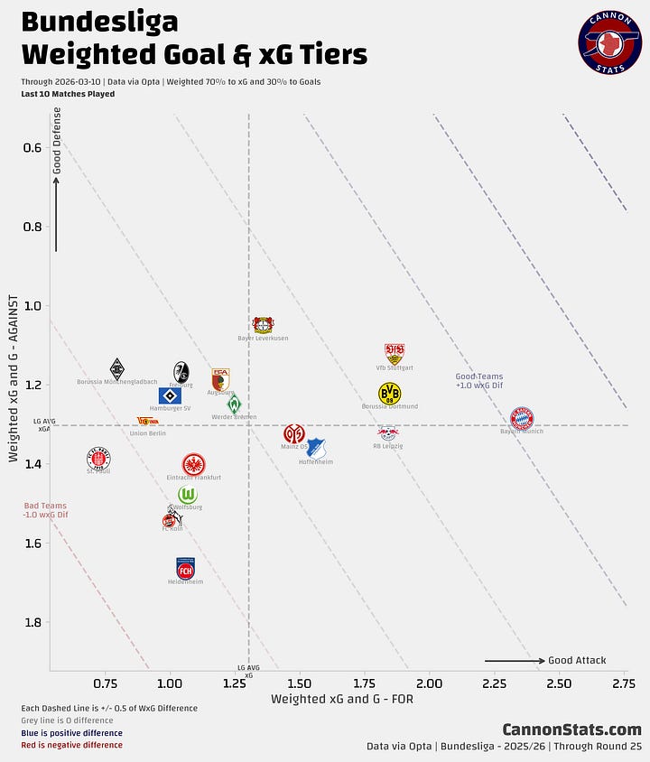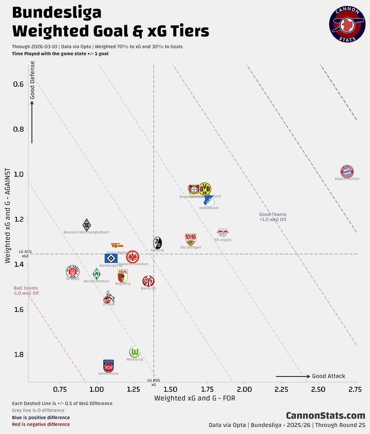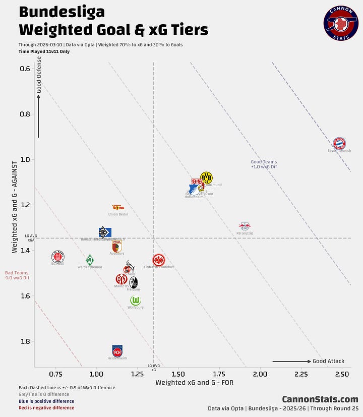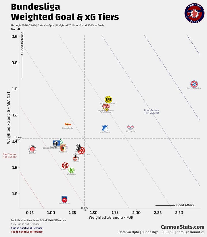 In the Bundesliga, Bayern is in their own class and that always makes these graphics look a little funky. Outside of the super team in the League, Leverkusen compare pretty well coming in as roughly the 4th best attack combined with the 3rd best defense.