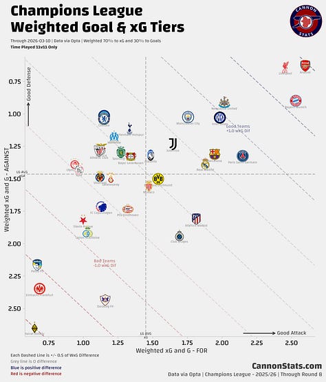 It’s important to include the League stats here but with the Premier League diverging in style (and overall quality) what is probably more interesting is looking at how the teams have compared in the Champions League.