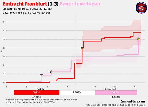 Leverkusen surprisingly have the edge on total passes per match, and will have more per possession than Arsenal but they have tended to play in different parts of the pitch. Arsenal have continued to be Field Tilt FC, even if they aren’t quite as extreme in that regard this season, compared to Leverkusen they have played in the oppositions half much more.