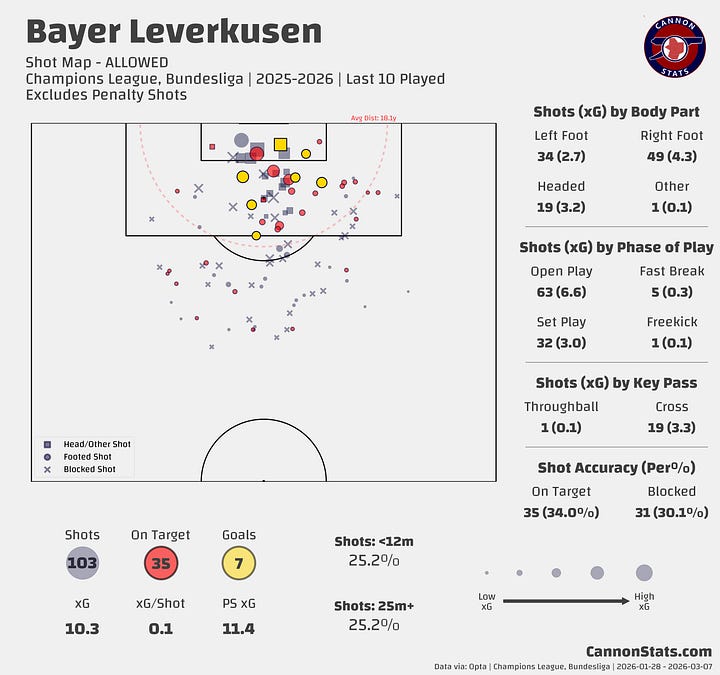 They won the xG battle by 0.5 or more in 5 of the 10 matches over this span, with the opposition managing to out create them just once (the most recent one).