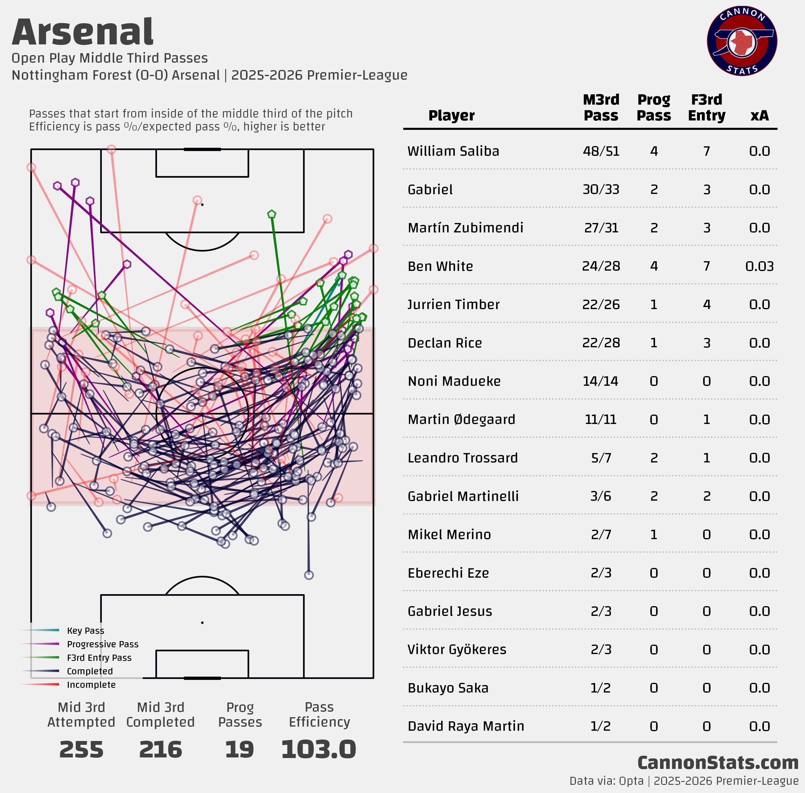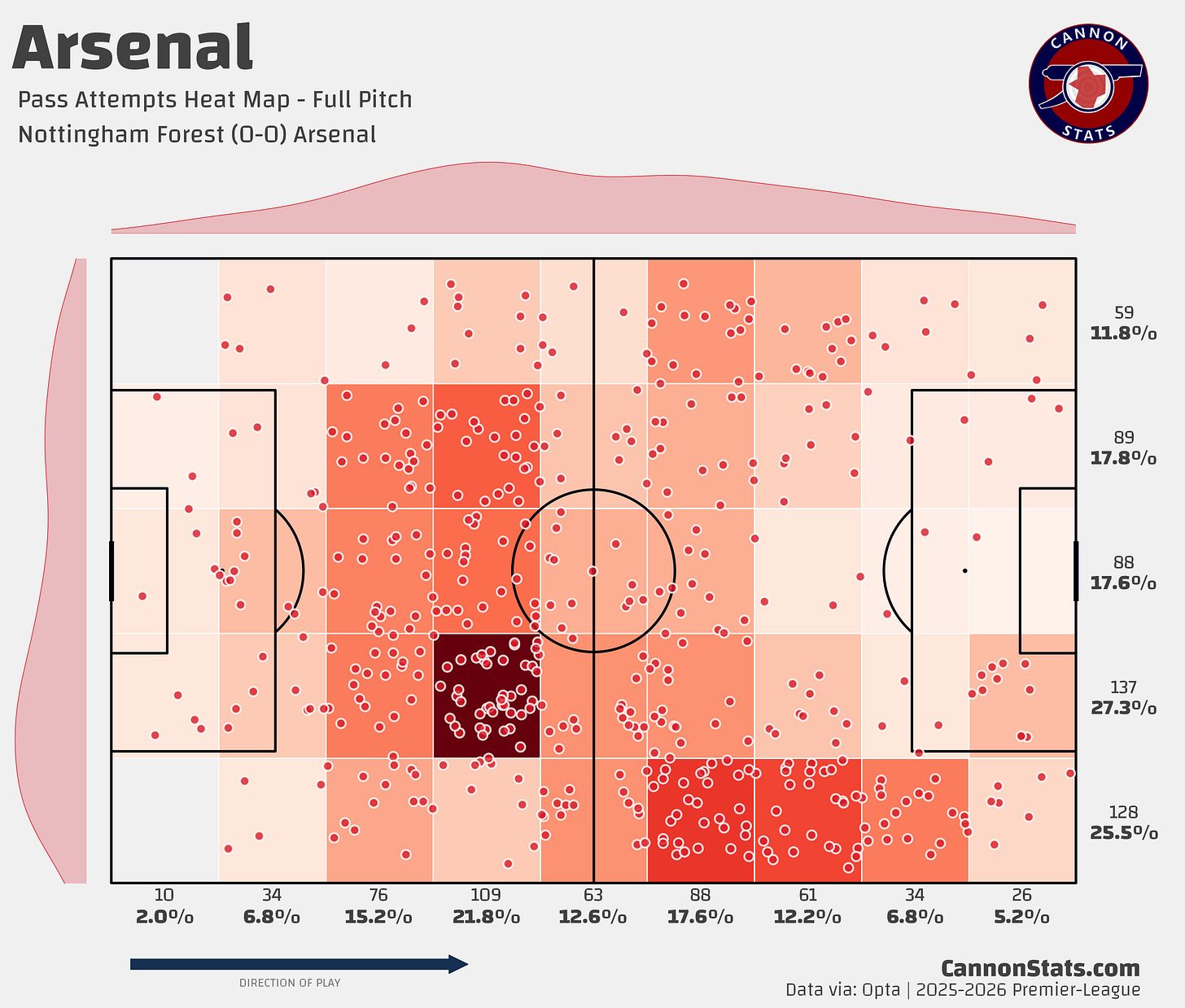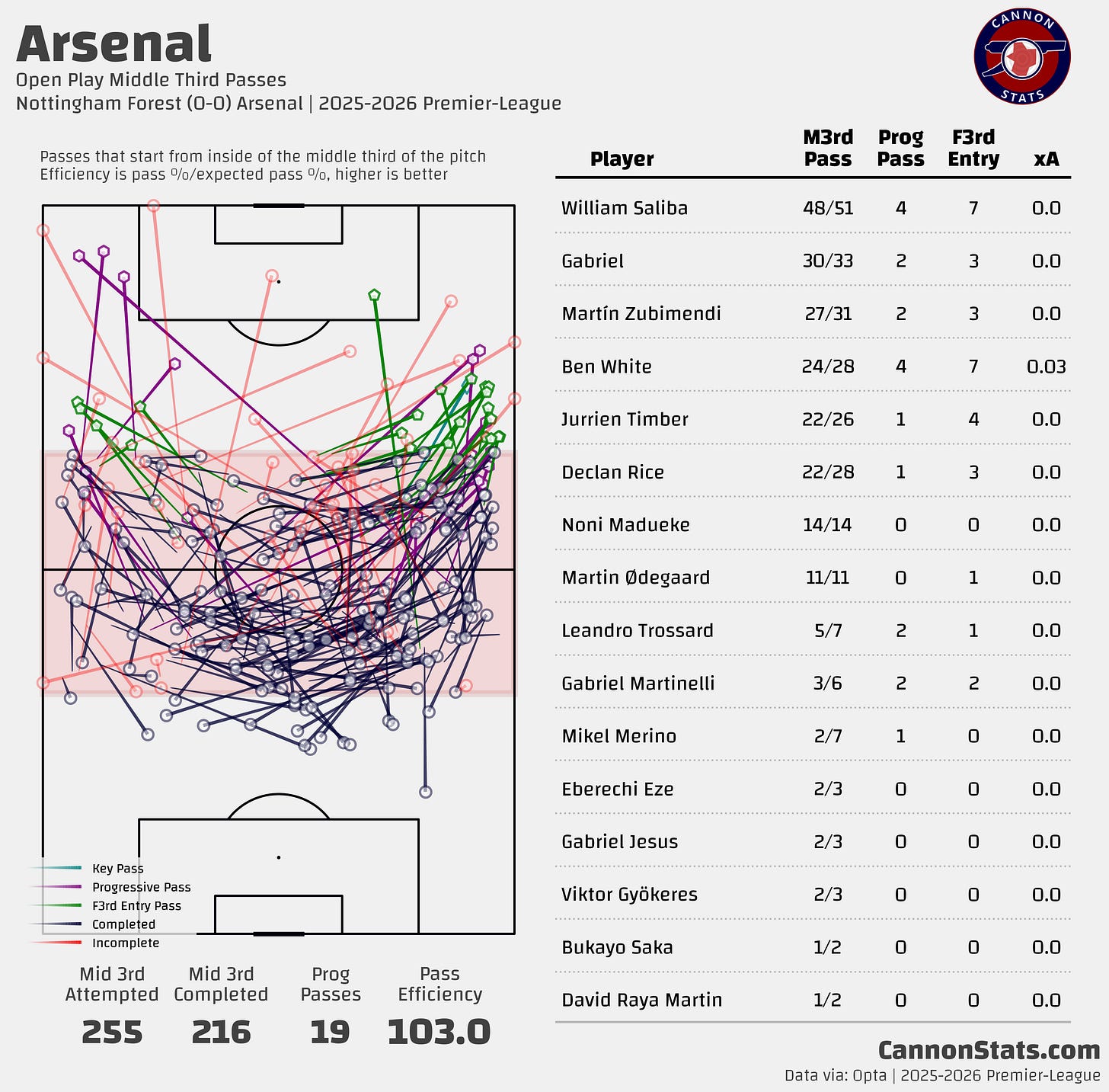 Looking at what Arsenal did passing in the middle third it shows exactly this, Forest content to let Arsenal progress out wide but giving nothing in the middle or even the half spaces.