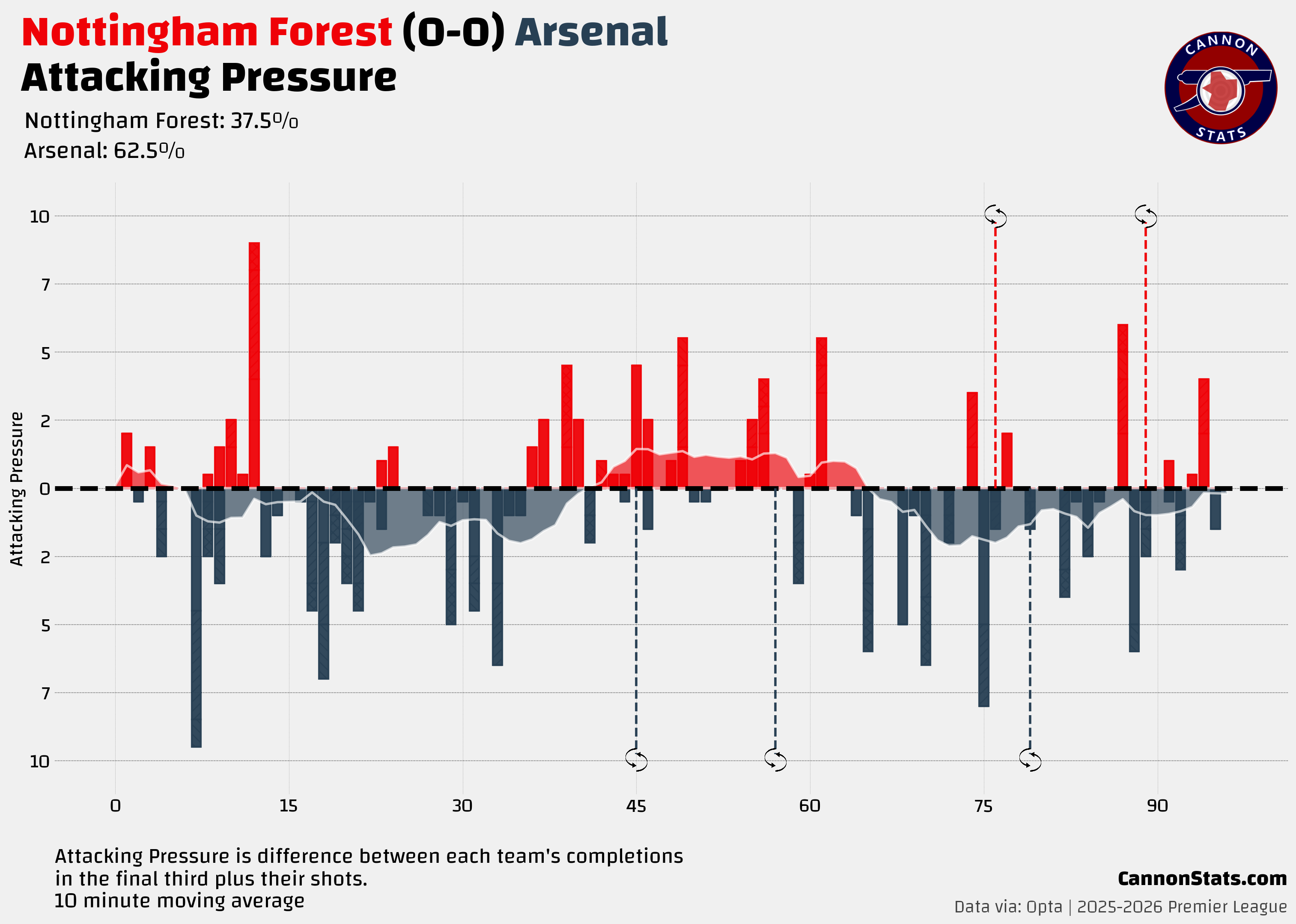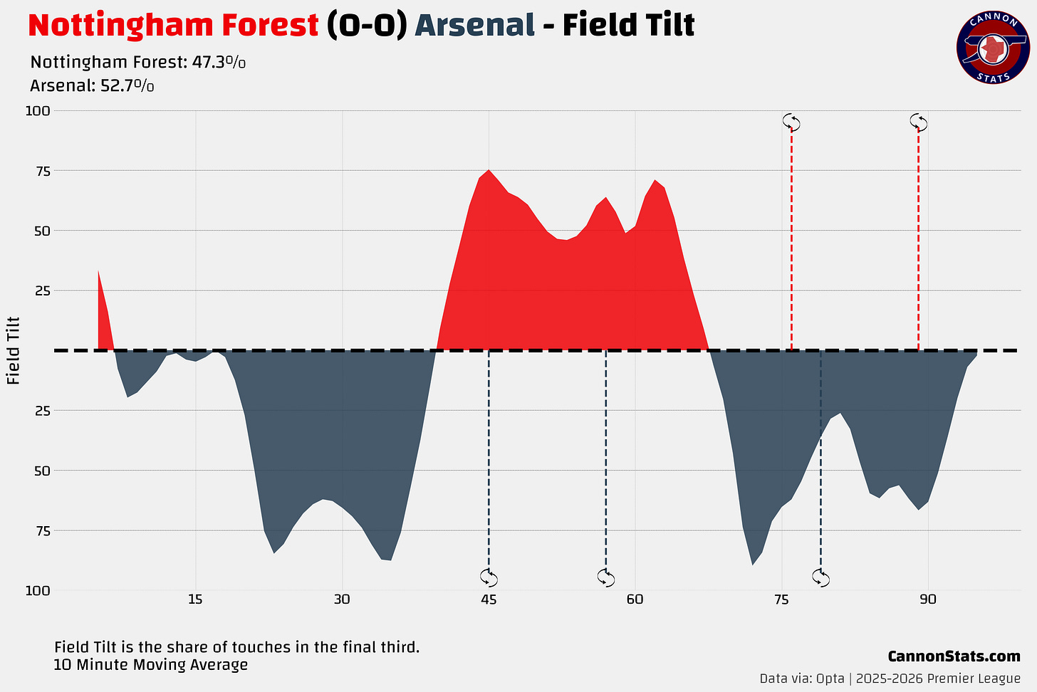 Arsenal were not nearly as dominate at pushing Forest back into their box here posting one of their lowest field tilts of the season and that also was reflected with significantly more time in the defensive and middle thirds.