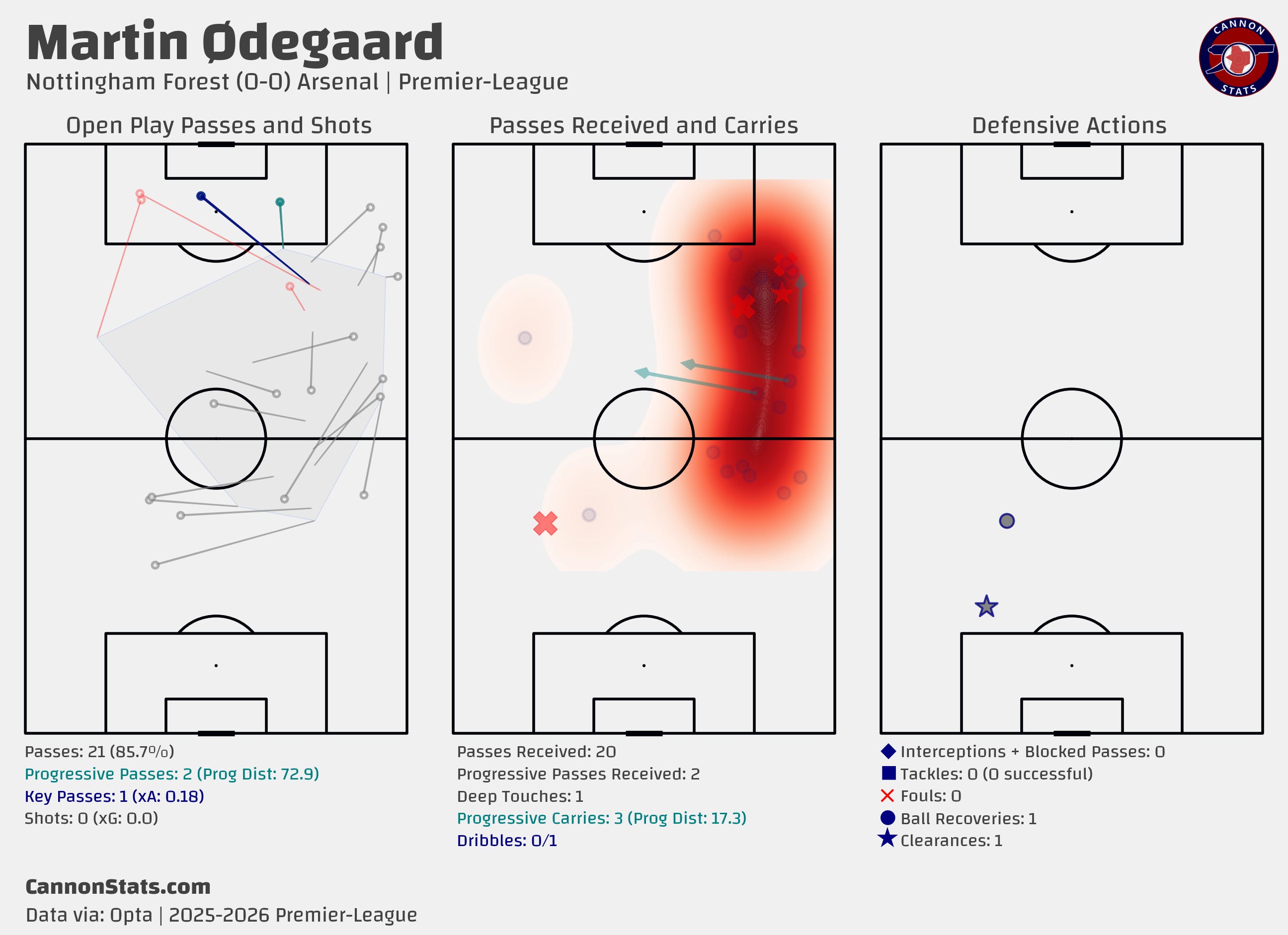 27 - Touches in this match. There have been just three instances where Odegaard has played 50+ minutes for Arsenal and had fewer touches, 24 vs Brighton last season (Red Card match), 21 at home vs Manchester City in January 2022 in a 2-1 loss, and 24 away against Manchester City in August 2021 in a 5-0 loss.