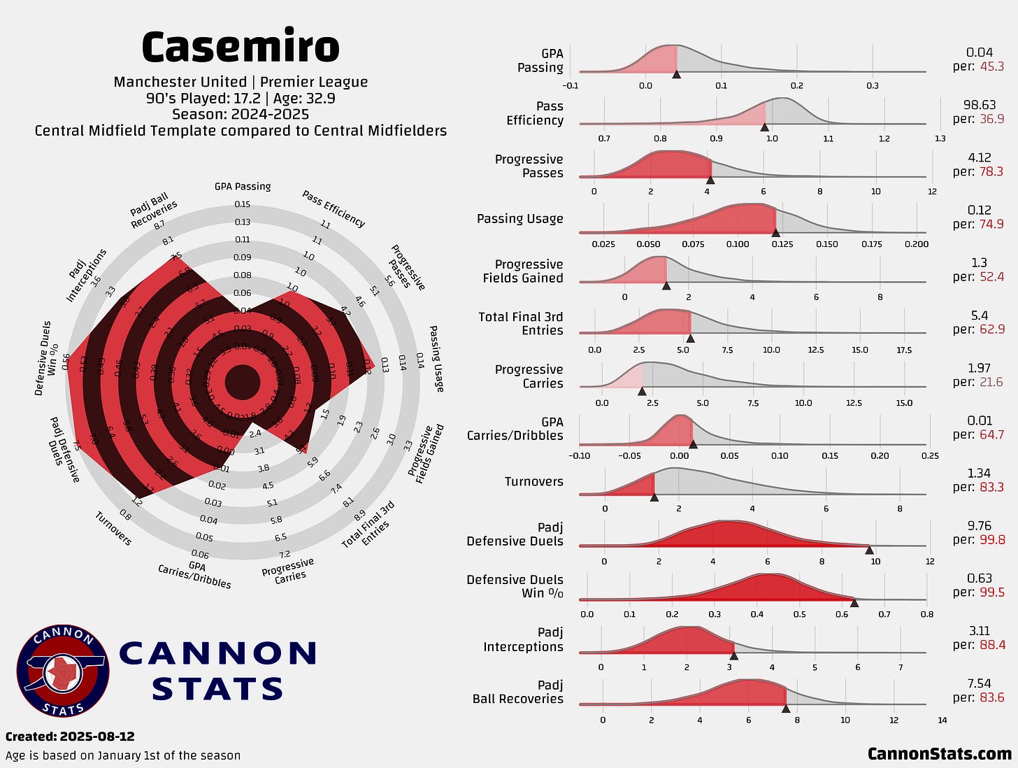 The last major part of the midfield right now is Casemiro but this is not the same player who was a major contributor to winning Champions Leagues at Real Madrid (he also isn’t paired with a Kroos and Modric). Casemiro was never the major ball progressor and that hasn’t really changed as he as aged. He still puts up good ball winning numbers but the guy that could cover world class levels of space is not coming back.