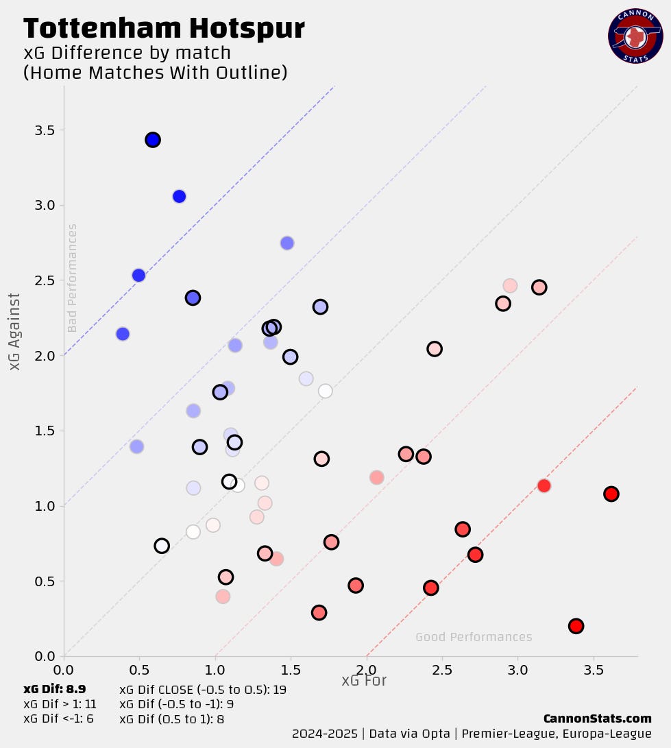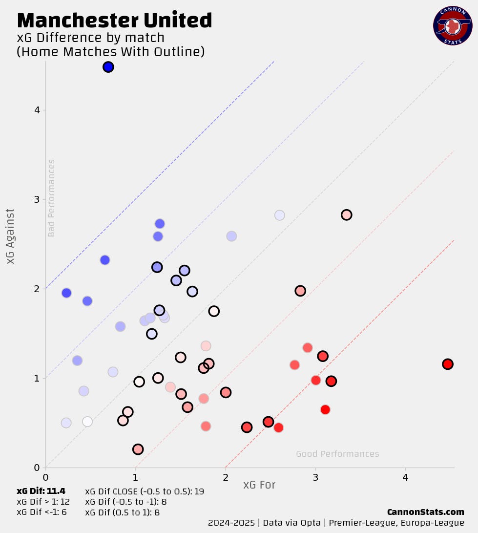 There is a bit of a silver lining in that for much of the second half they were focused more on the Europa League over the Premier League but even looking at the combined data including both it doesn’t drastically improve them from a team that looks solidly midtable.