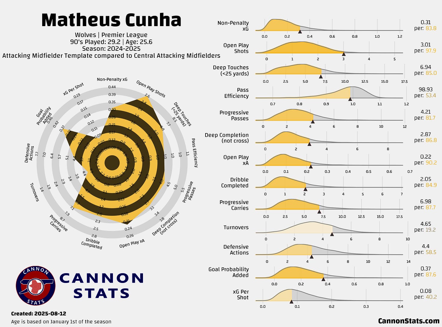 I think that to get the best out of Cunha a team needs to make him the center piece and that is something United can offer him (and one of the reasons I wasn’t sold that it was a good fit at Arsenal). Cunha is a good ball striker and a volume shooter so expecting that he might be a bit better than the underlying xG probably isn’t crazy but what you can almost certainly no expect is that he will double up his xG on a consistent basis and that was a major factor that pushed him to 15 goals last season.