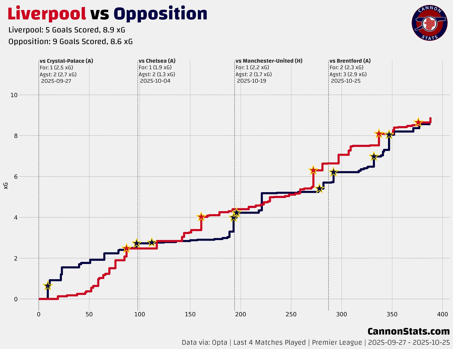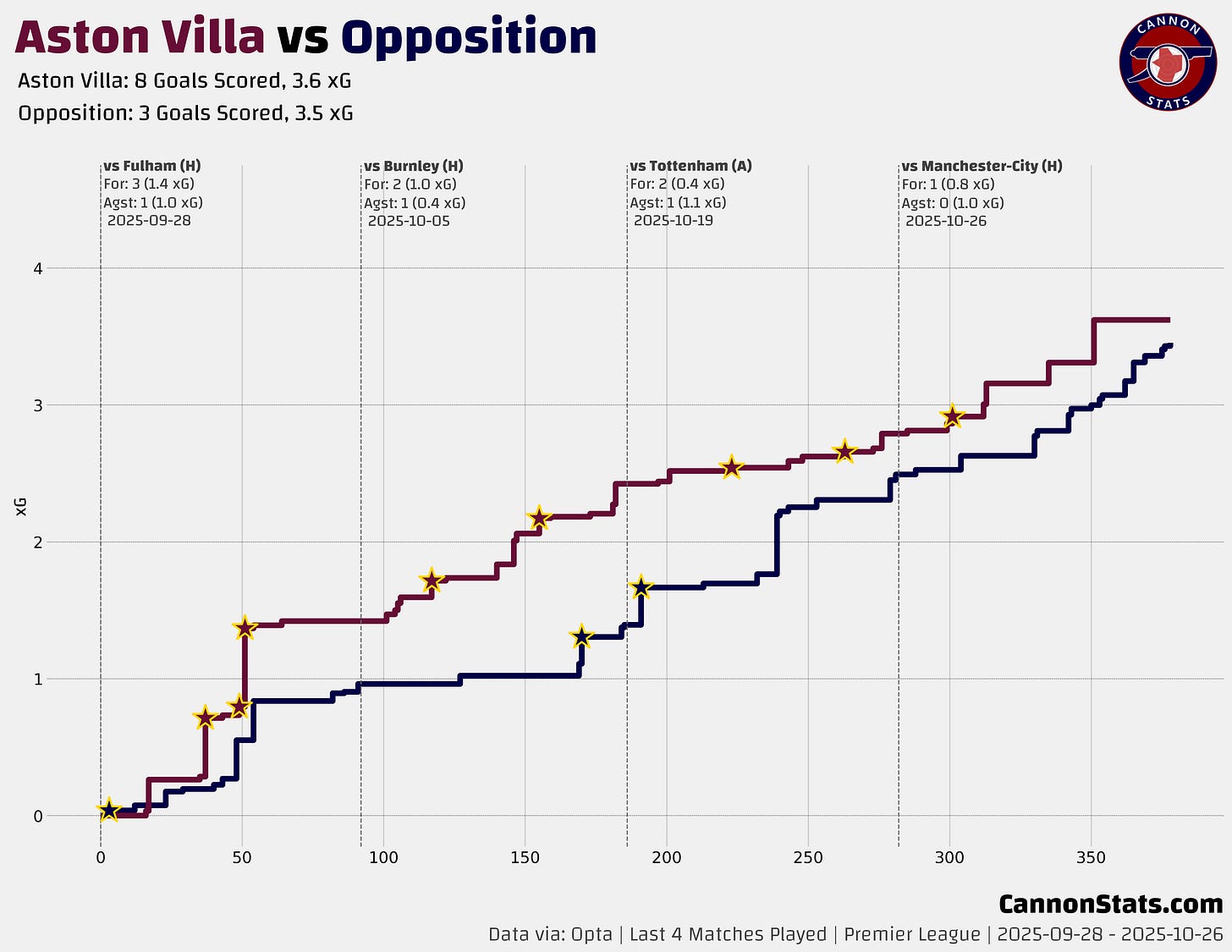Looking at how the team’s have played over the last four, the style of the matches is significantly different (the Villa matches haven’t featured many chances, and the Liverpool matches are nothing but chances) but it’s a funny one that comes out with Aston Villa +0.1 on xG difference and Liverpool at +0.3 on xG difference