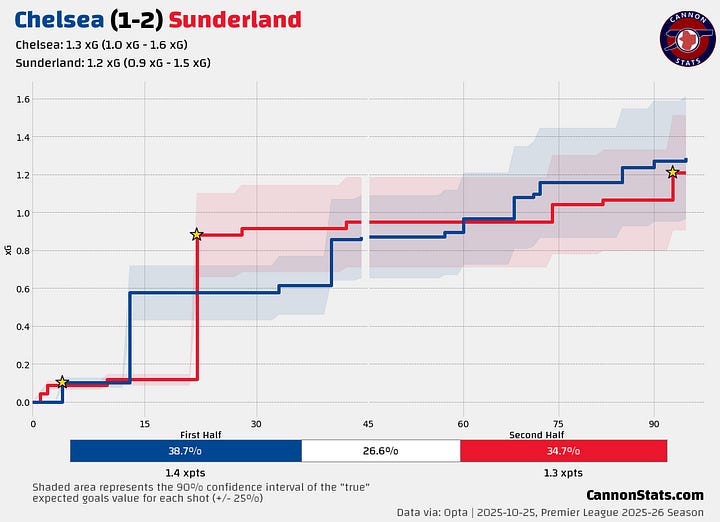 Chelsea remain a tough team to try and get a feel for how good they actually are. They lost and played pretty poorly last weekend against Sunderland. They have a big win against West Ham that gives their numbers a boost. Looking at how they have played with the game close and they are very much in the group where things are very meh.