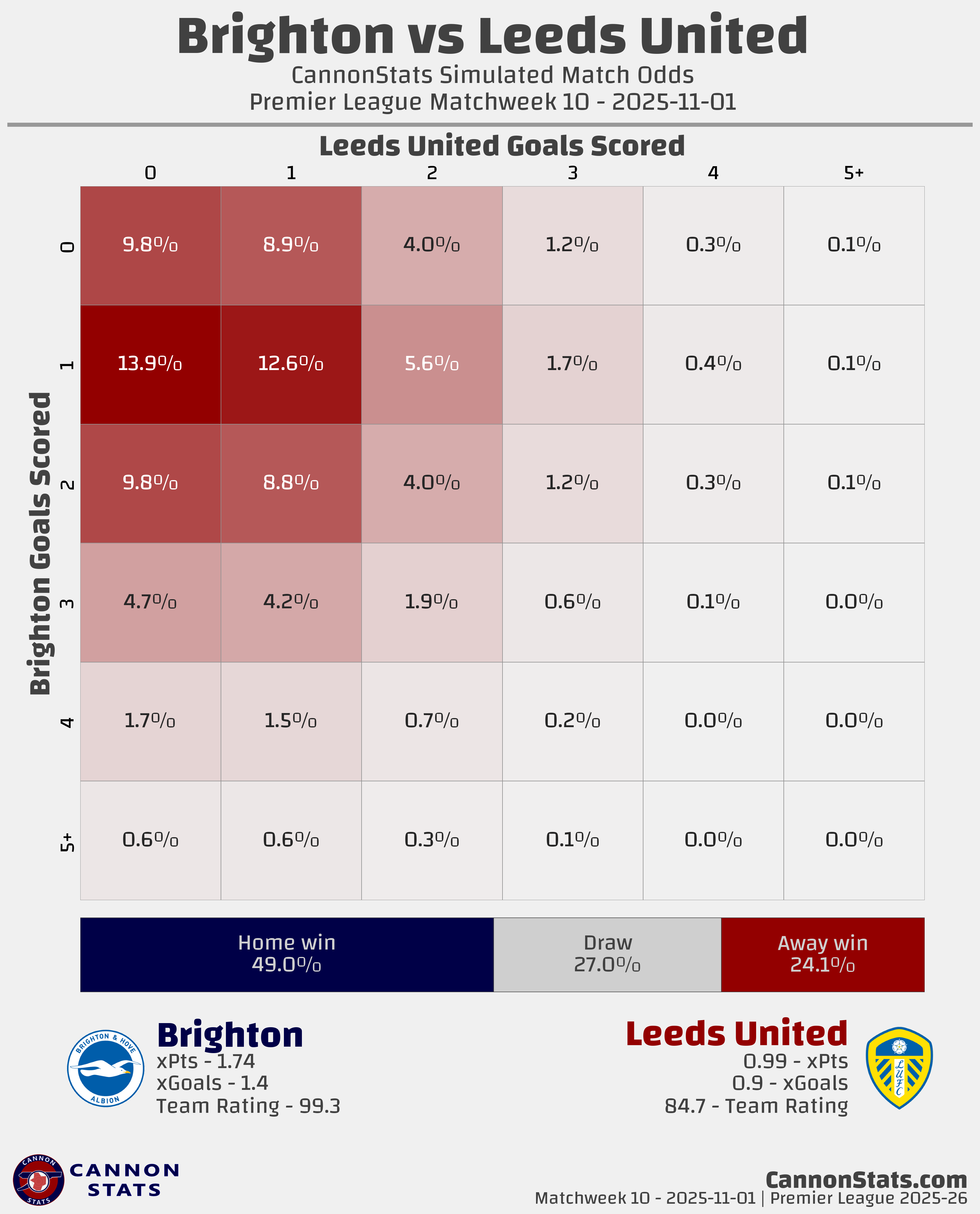Brighton: Scott - 49.0%, Betting - 50.5%, Opta - 66.3%