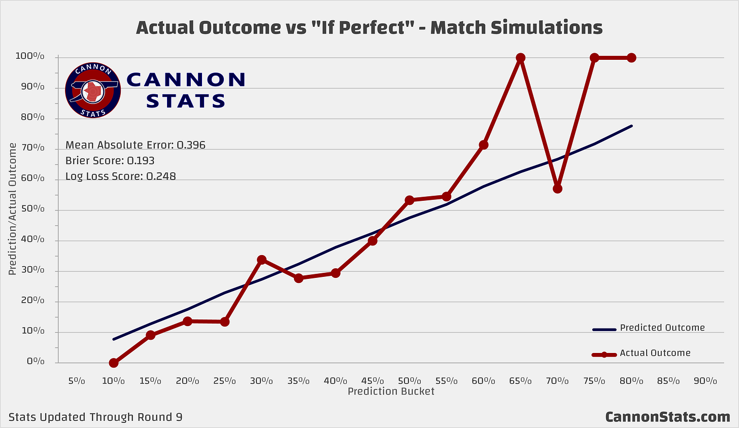 I am very pleased with how this is performing overall so far this season and I continue to be in the situation where I probably could spend more time trying to get a bit more accurate but the time spent working on that probably isn’t worth it given I really just want these to be in the overall ballpark for the match odds.