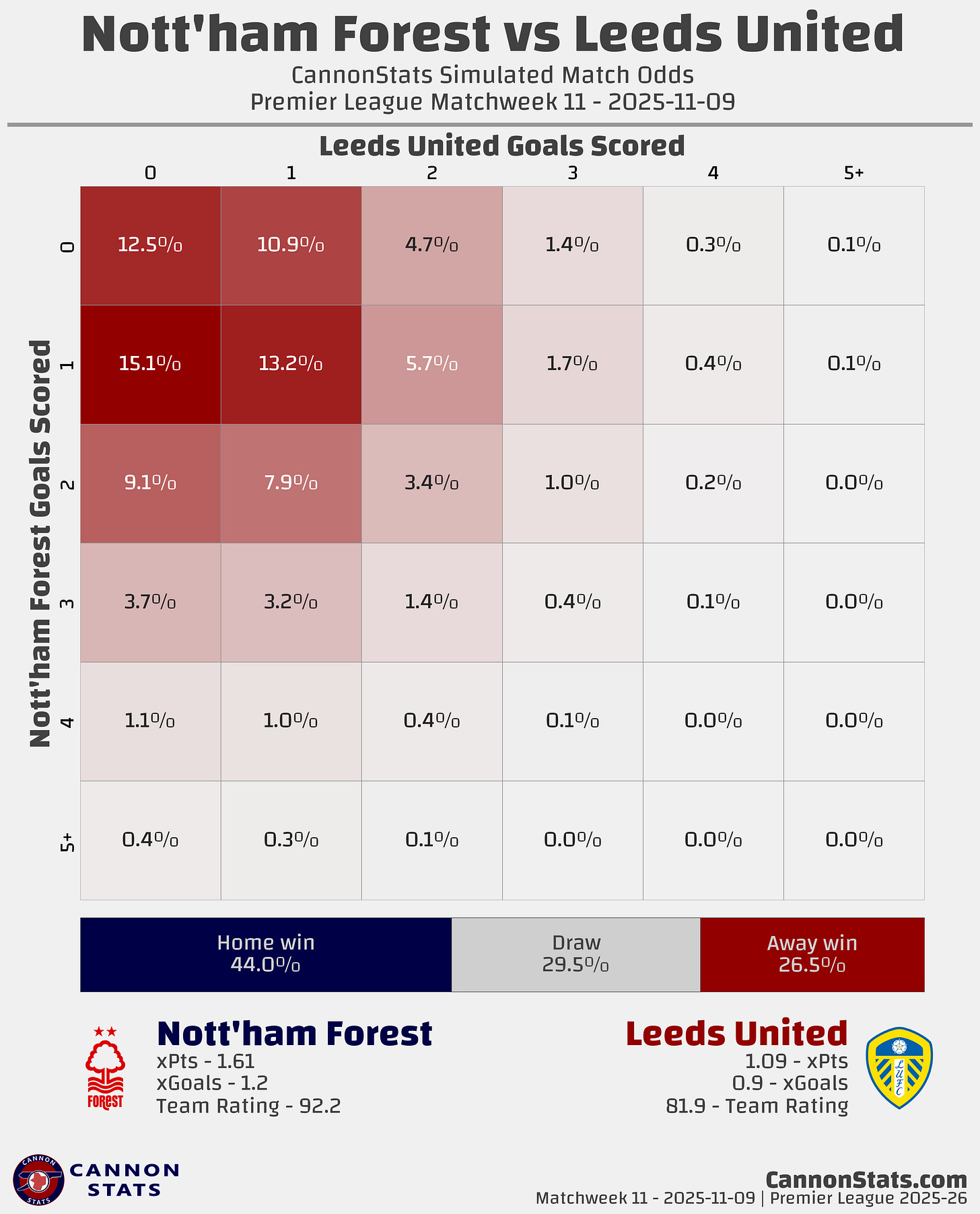 Nott’ham Forest: Scott - 44.0%, Betting - 41.9%, Opta - 50.9%