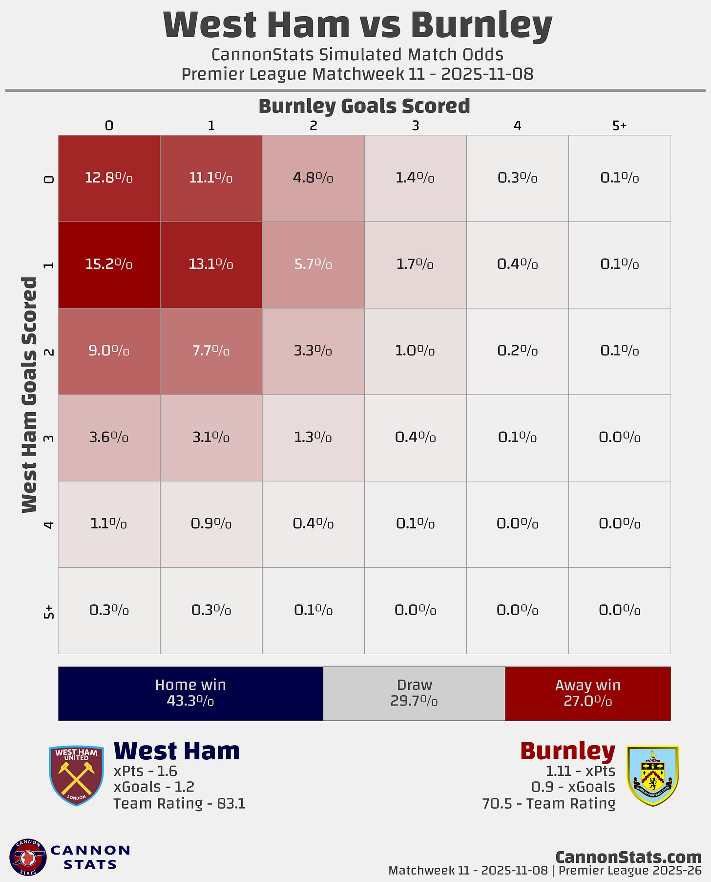West Ham: Scott - 43.3%, Betting - 48.5%, Opta - 47.9%