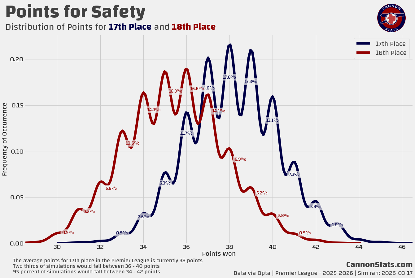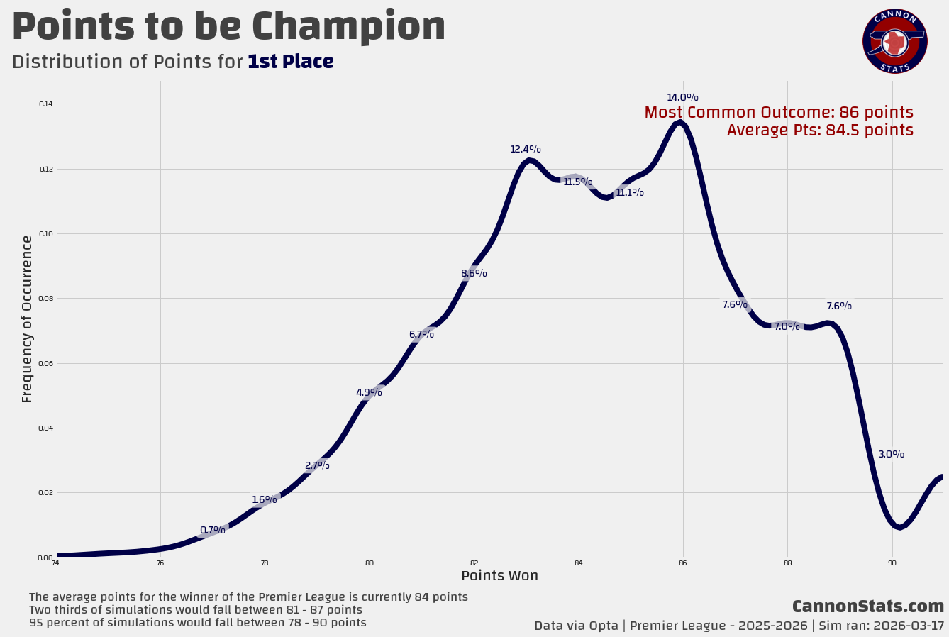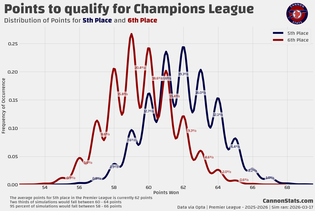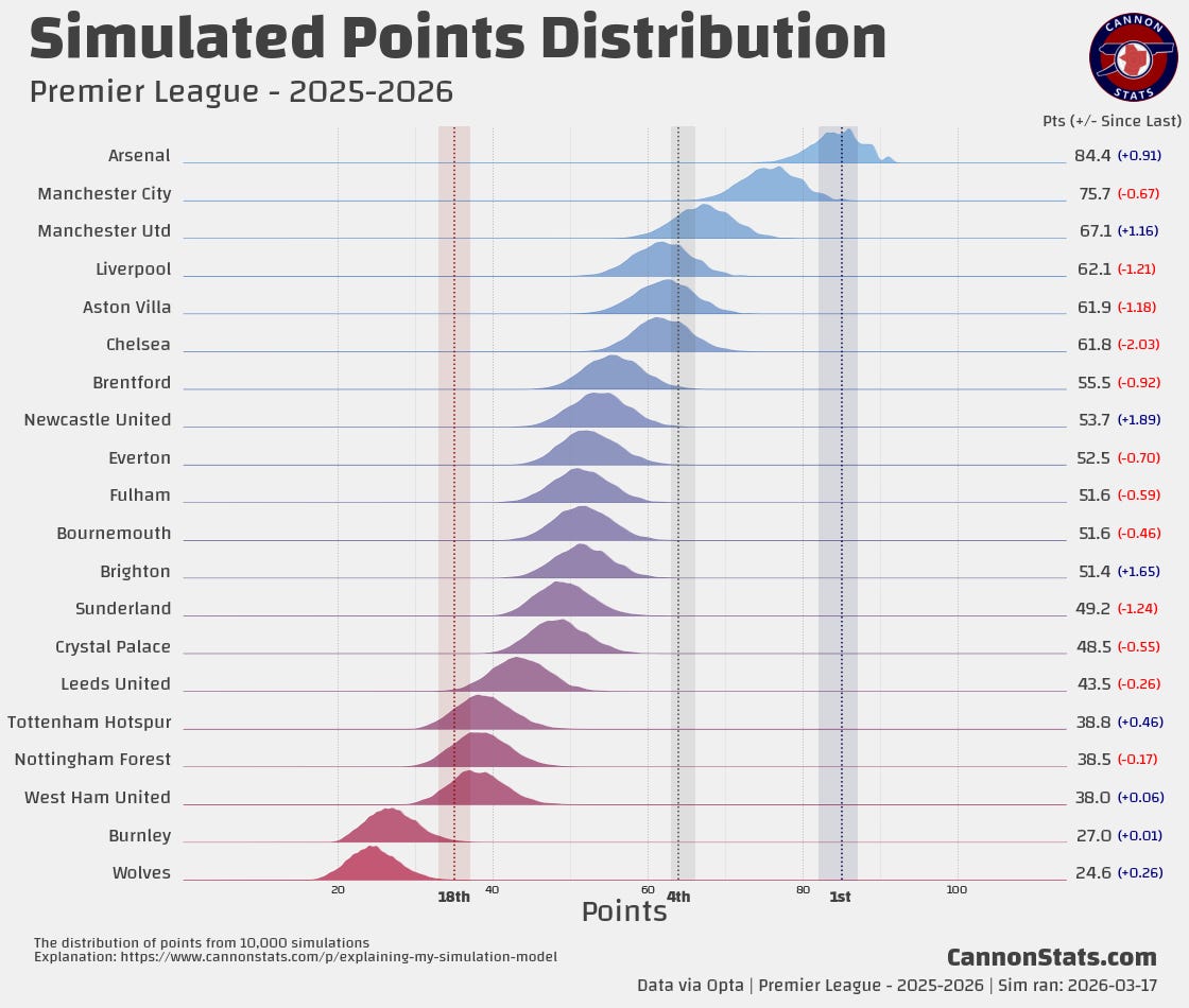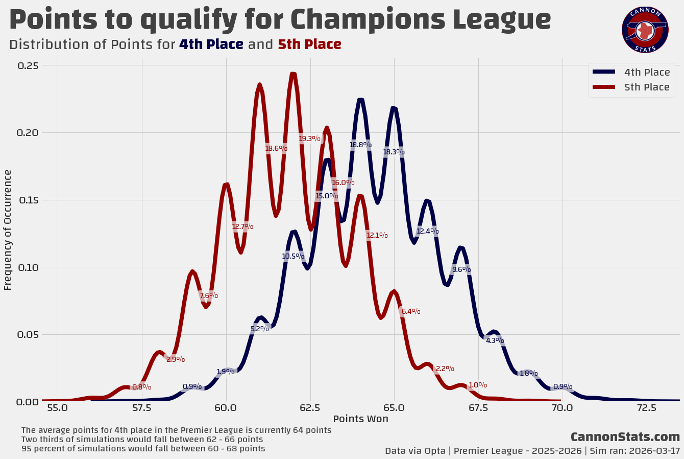 These graphics show the distributions for some of the key races. These help to illustrate the tipping point spots that would be required to get more points than second (win the title), finish in the Champions League spots, and ensure safety.