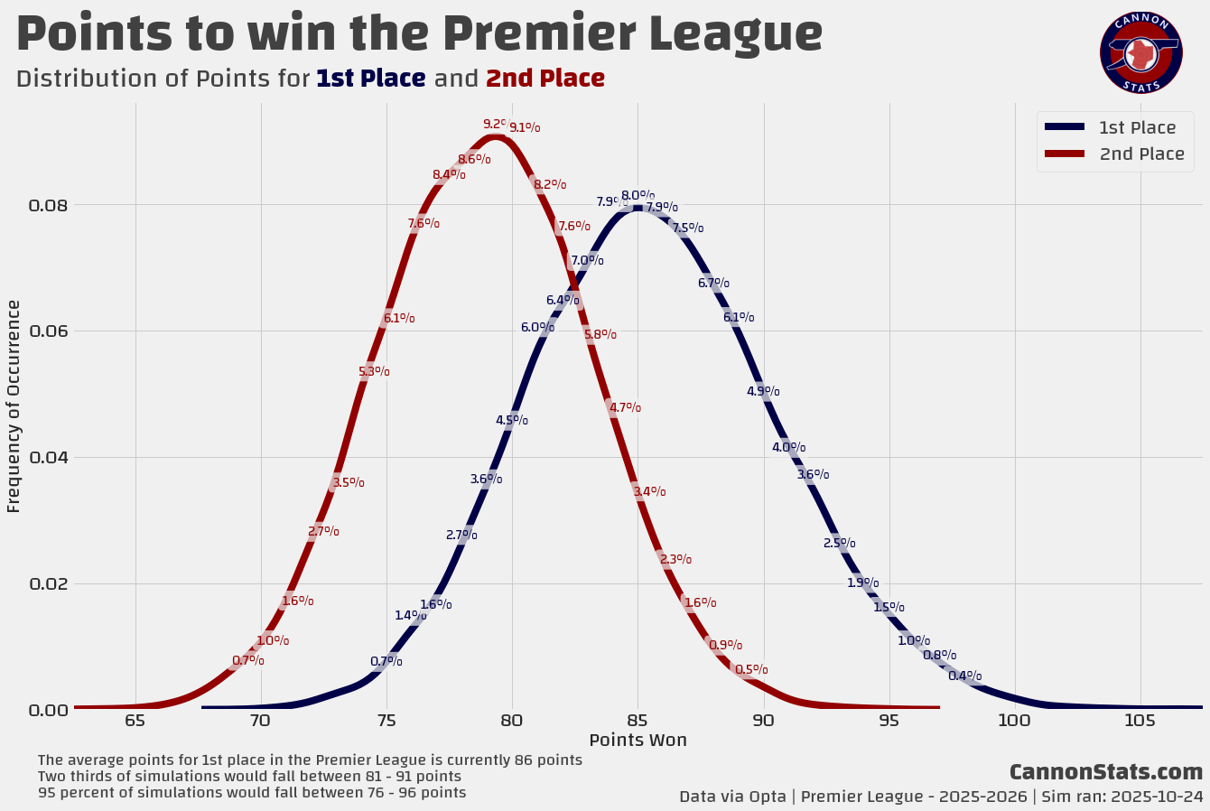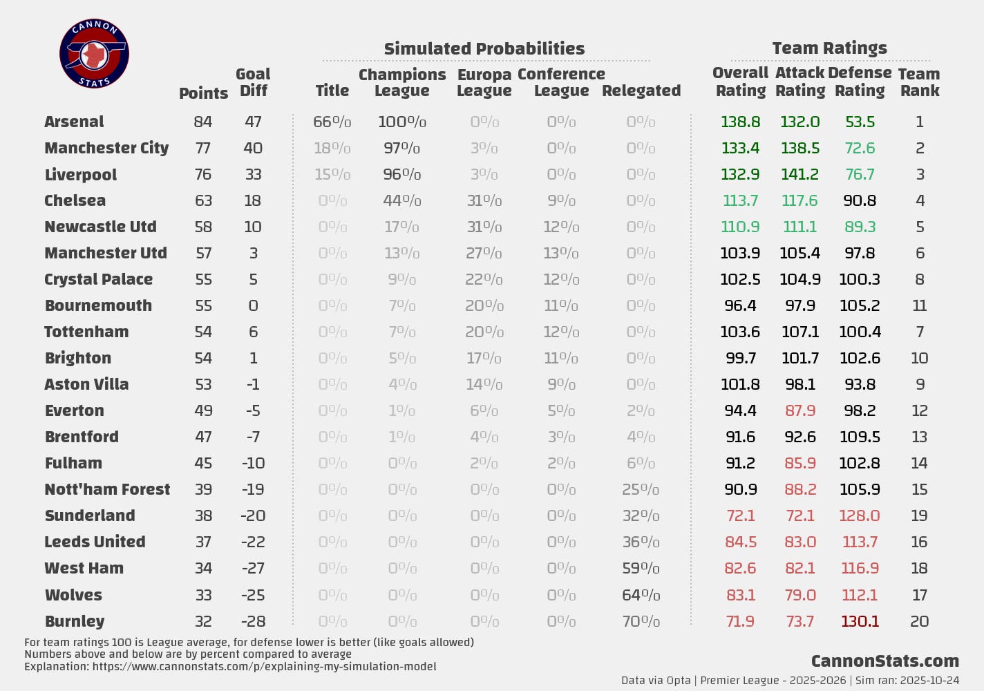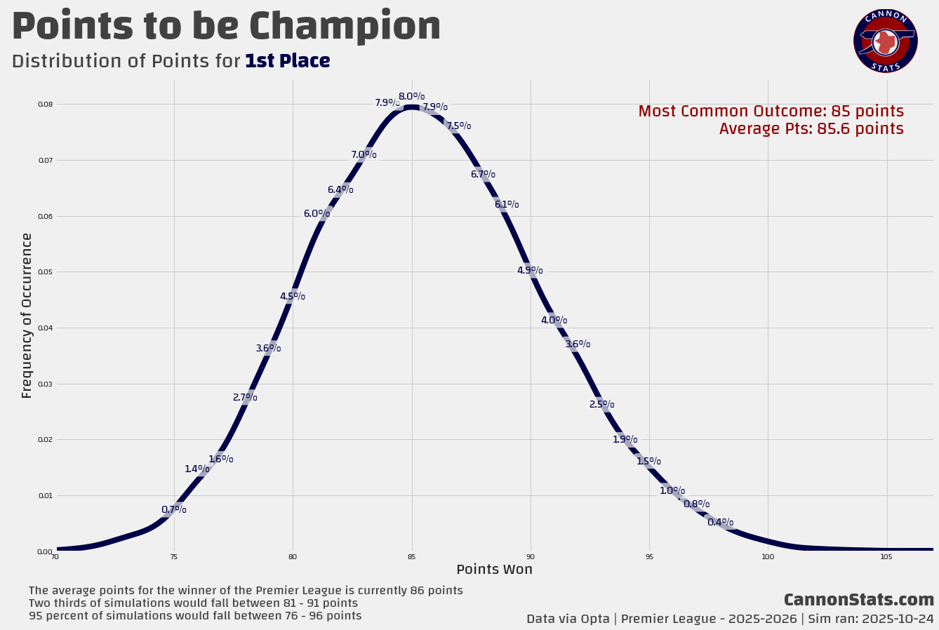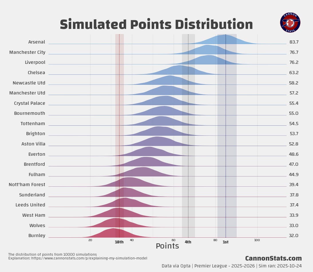Scott's PL Odds AnalysisPremier League Simulation - 2025/26 SeasonLatest simulation for the Premier LeagueScott WillisSep 08, 2025162ShareUpdated 2025-10-24:This page features Premier League projections from my model. I will try and keep this updated at least once a week after the model runs.Simulated Table and Outcomes:Team Ratings and Strength of Schedule:Key Race Points Distributions:PreviousNext