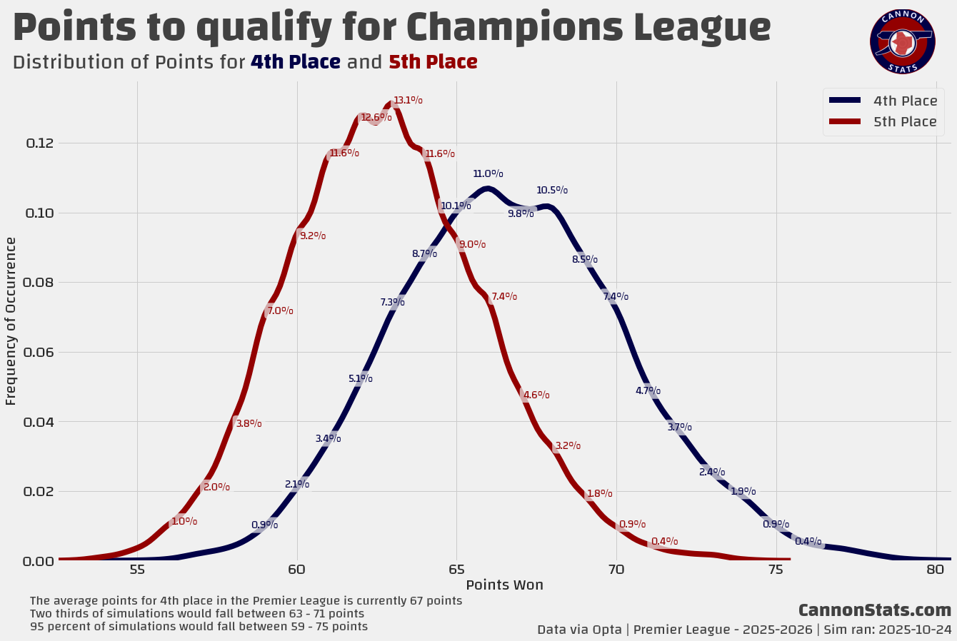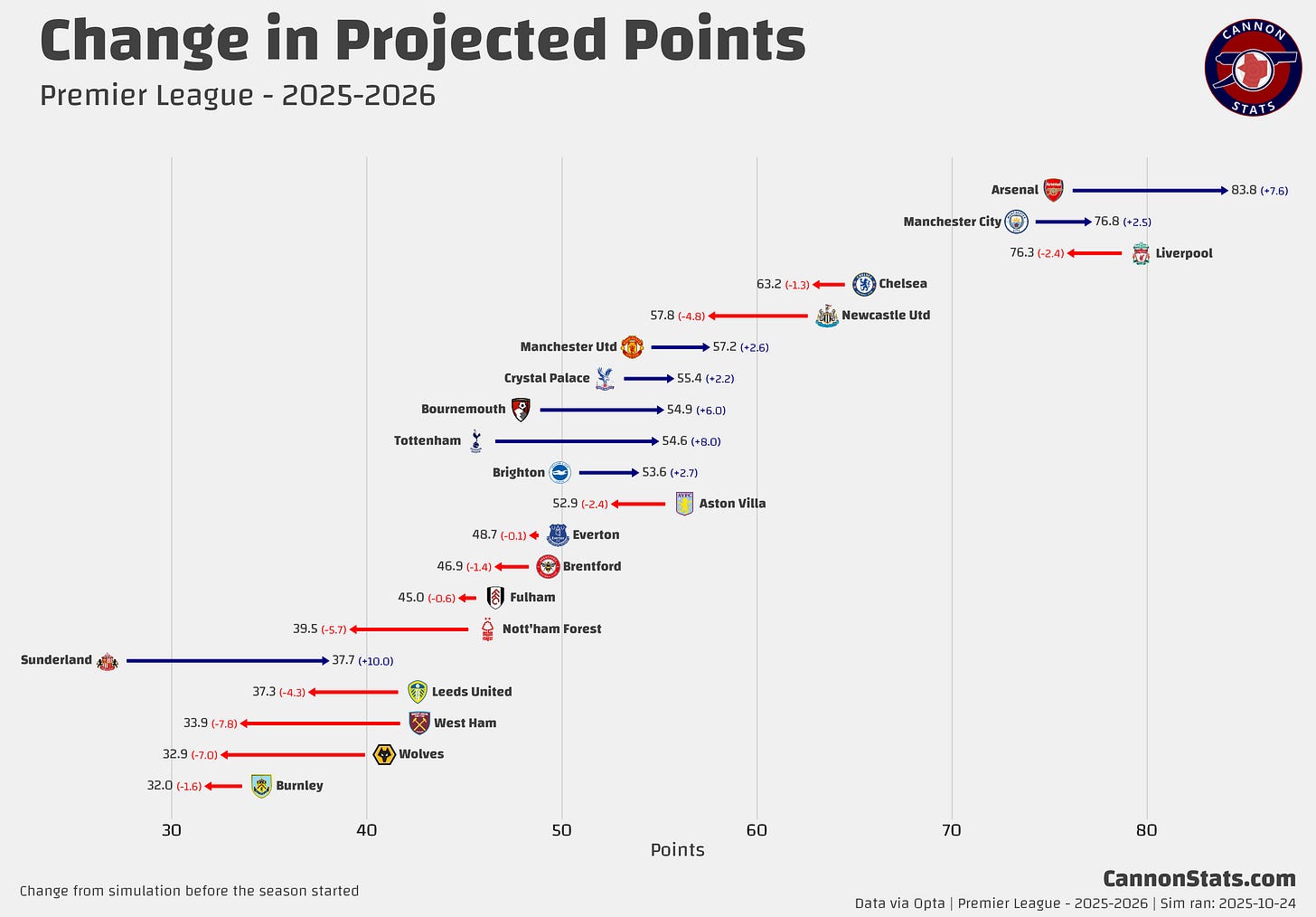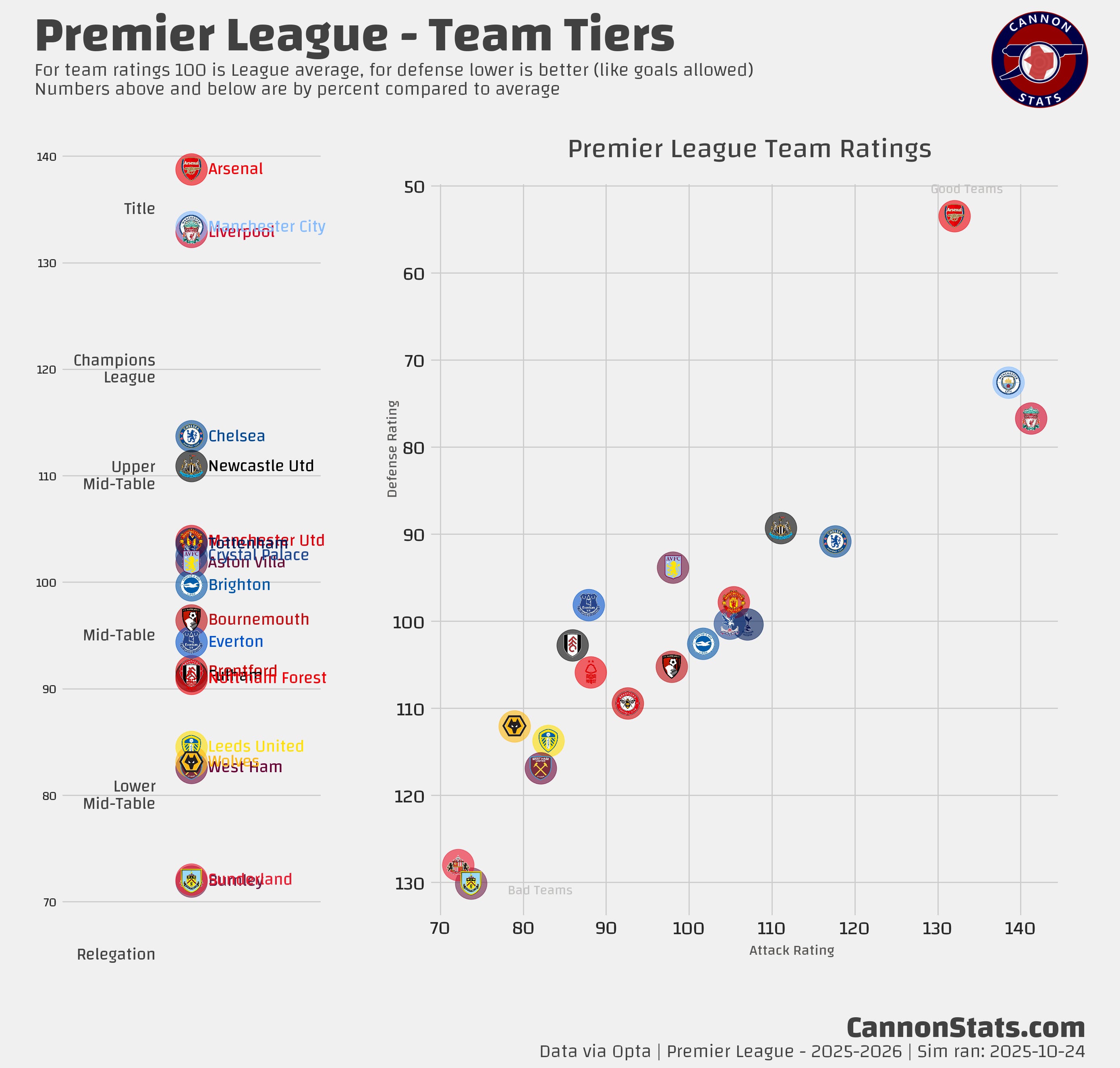 Scott's PL Odds AnalysisPremier League Simulation - 2025/26 SeasonLatest simulation for the Premier LeagueScott WillisSep 08, 2025162ShareUpdated 2025-10-24:This page features Premier League projections from my model. I will try and keep this updated at least once a week after the model runs.Simulated Table and Outcomes:Team Ratings and Strength of Schedule:Key Race Points Distributions:PreviousNext