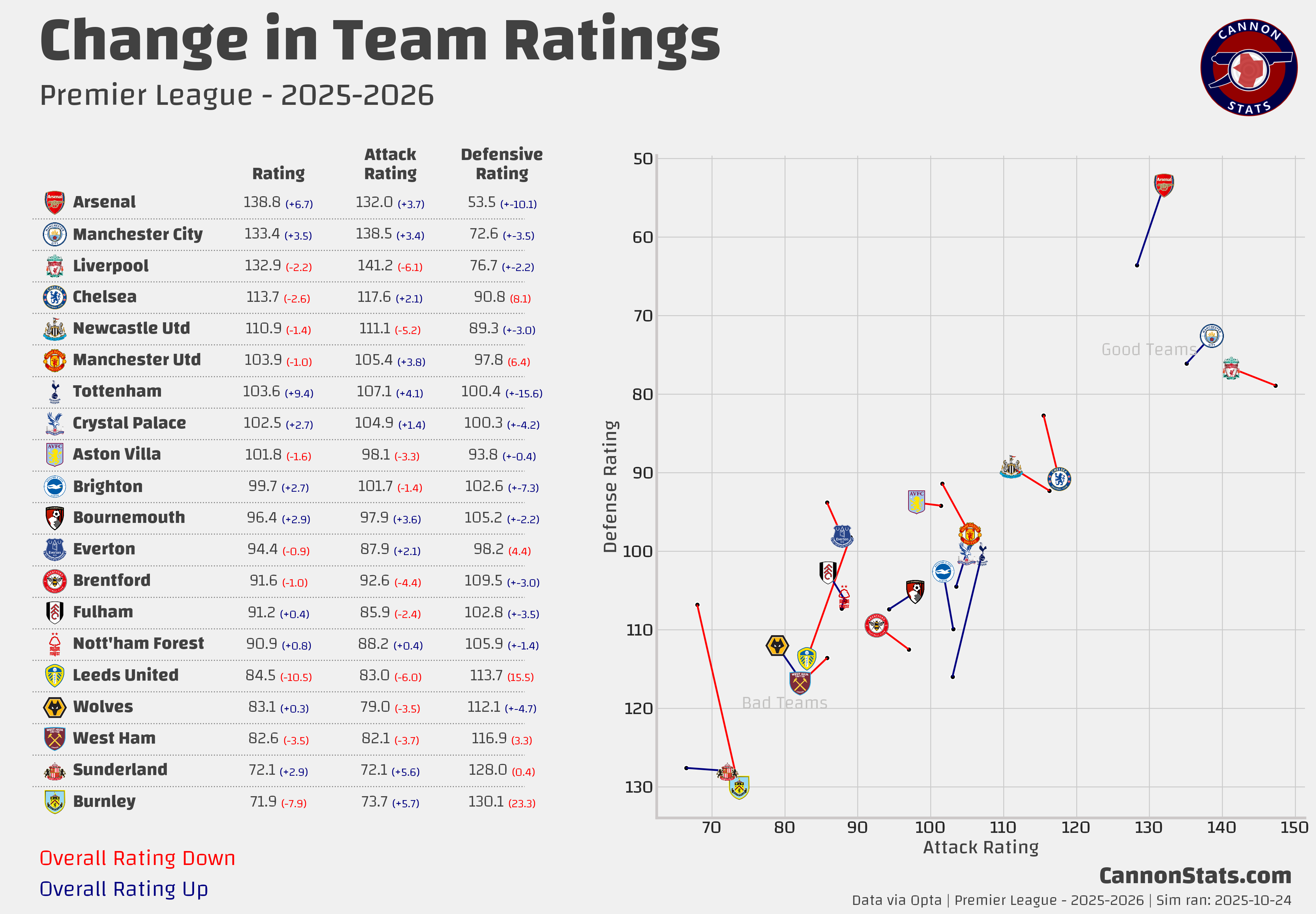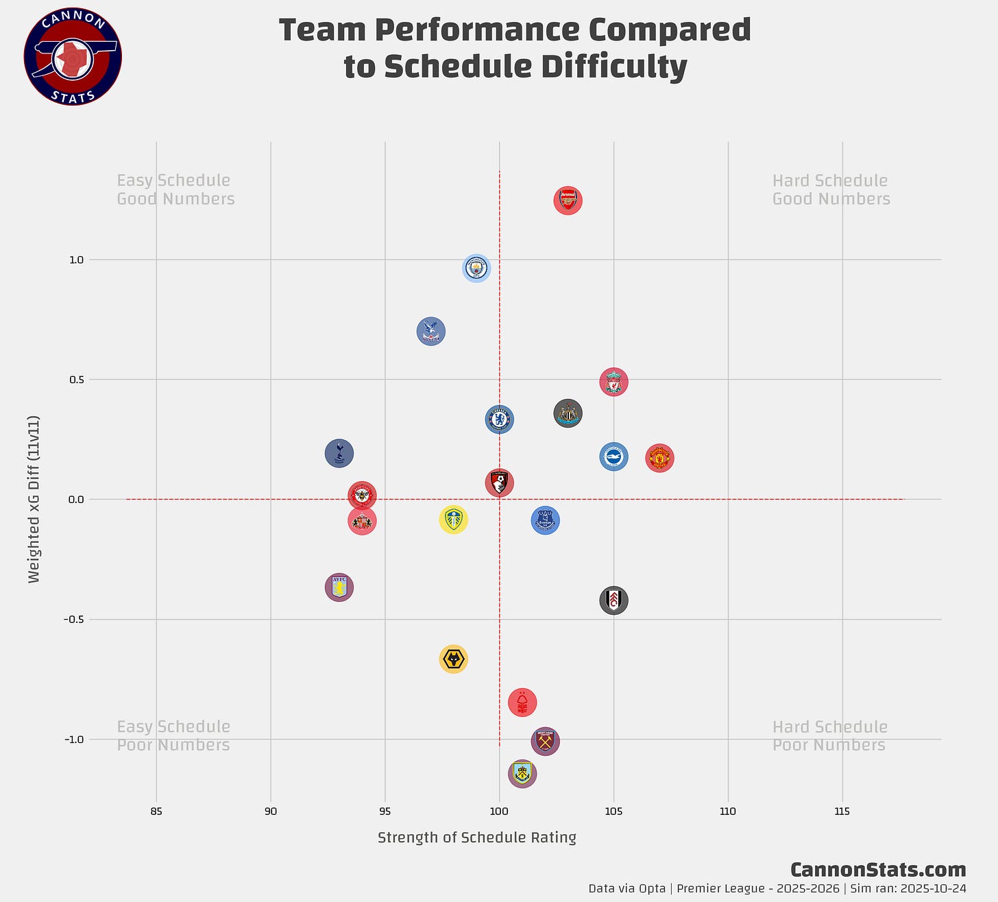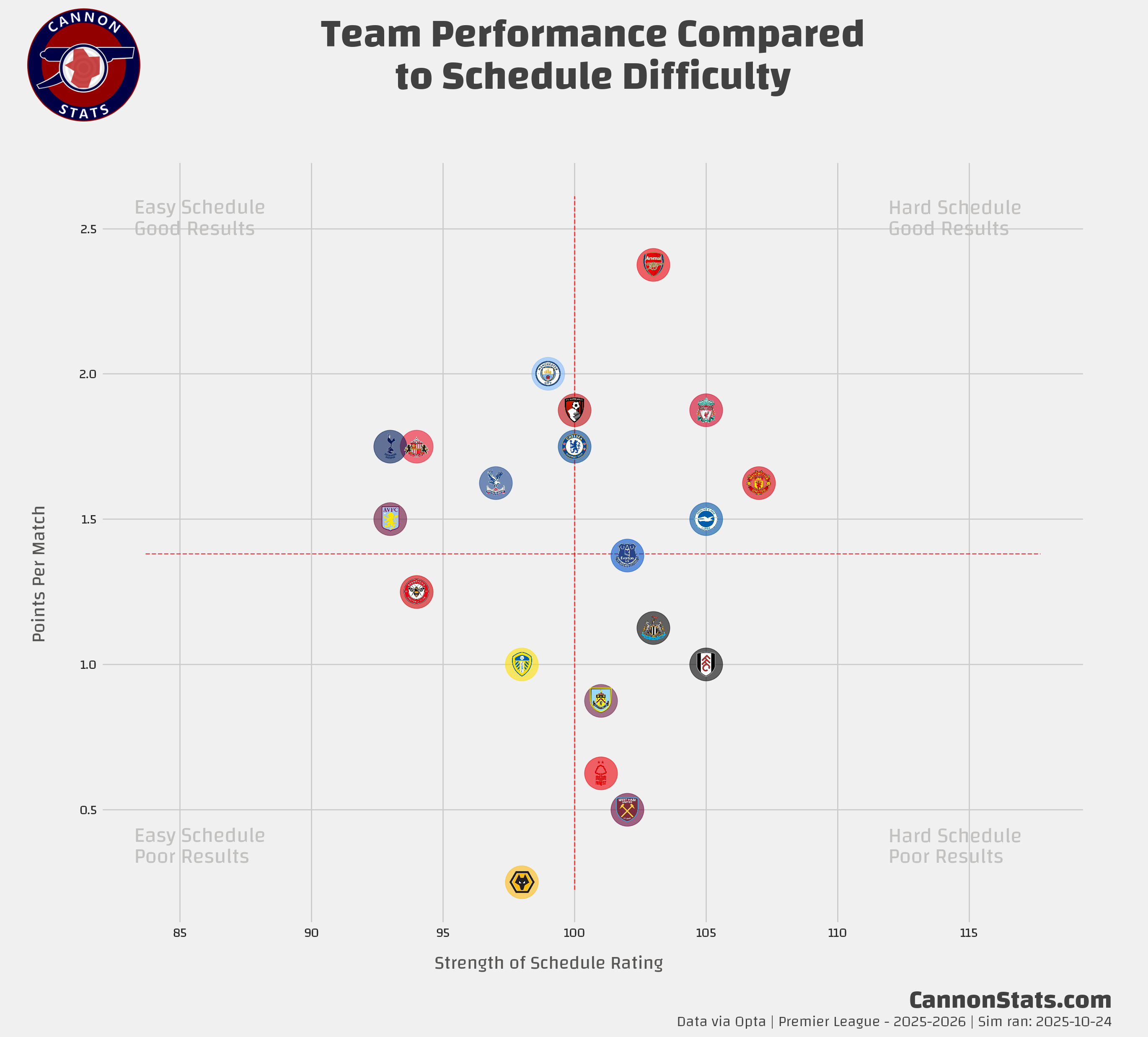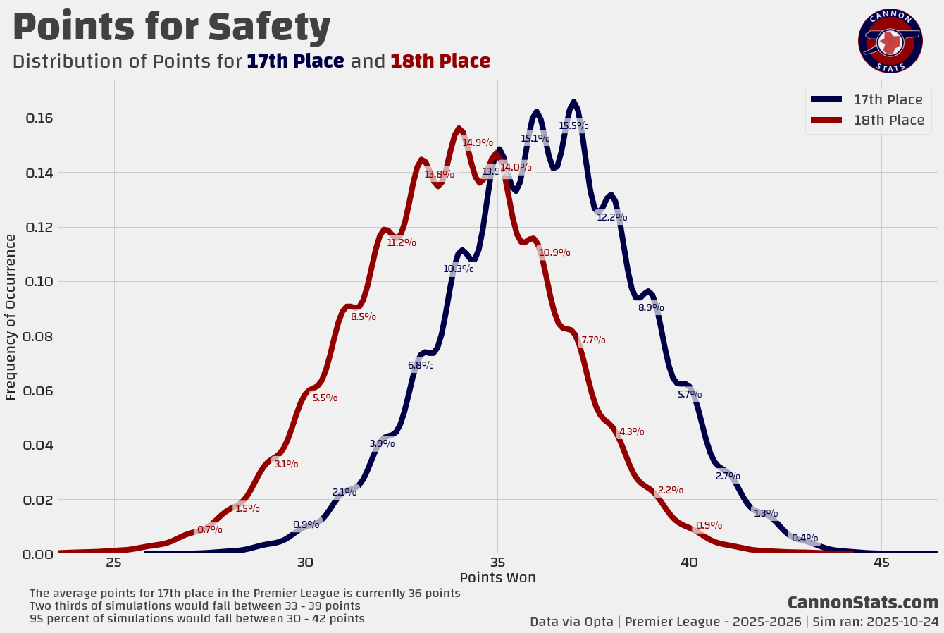 Scott's PL Odds AnalysisPremier League Simulation - 2025/26 SeasonLatest simulation for the Premier LeagueScott WillisSep 08, 2025162ShareUpdated 2025-10-24:This page features Premier League projections from my model. I will try and keep this updated at least once a week after the model runs.Simulated Table and Outcomes:Team Ratings and Strength of Schedule:Key Race Points Distributions:PreviousNext