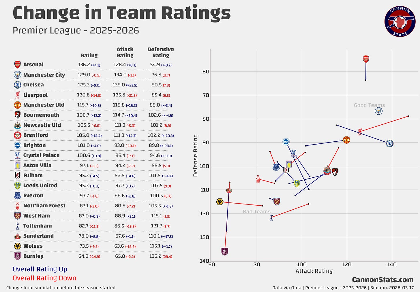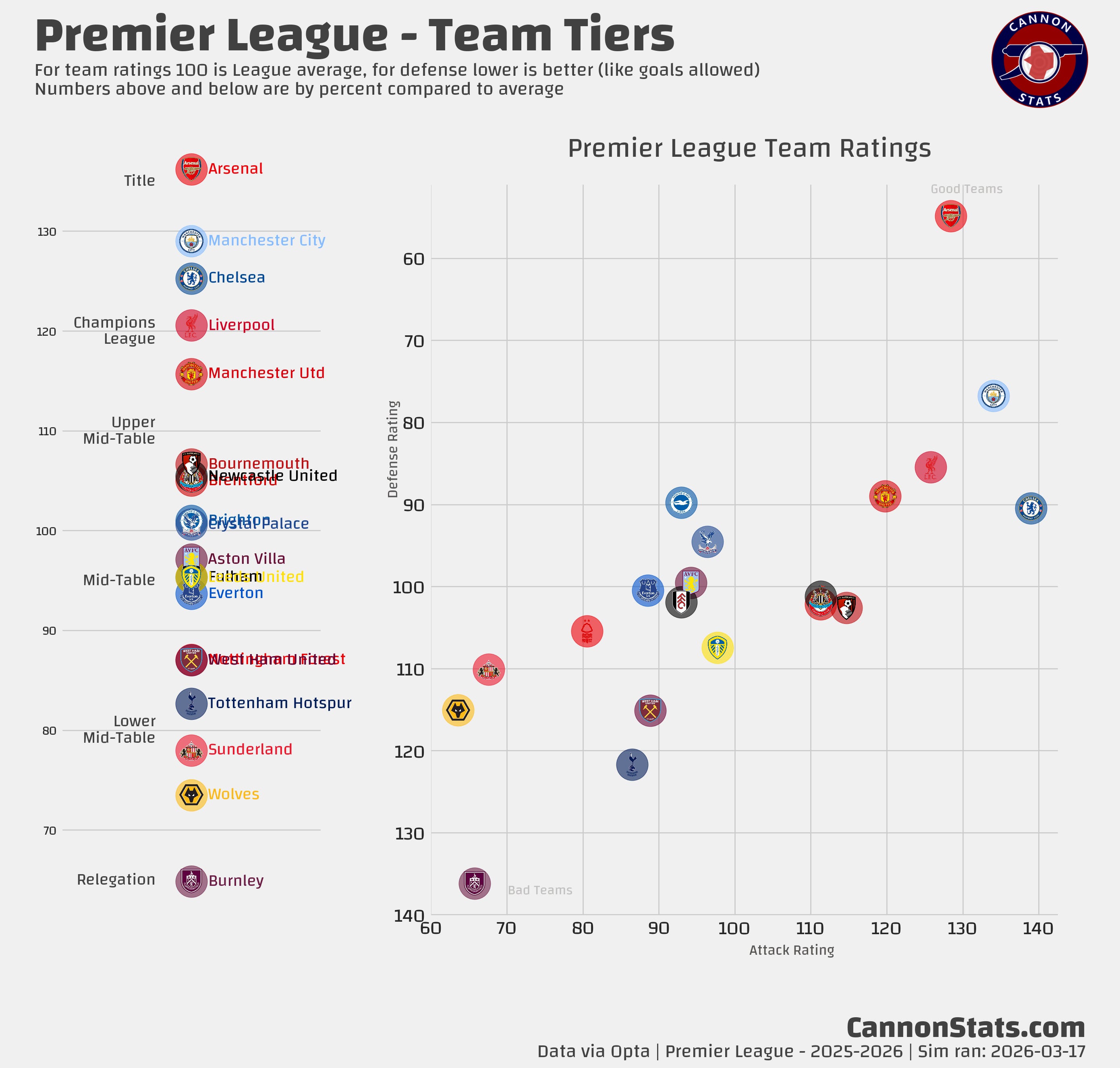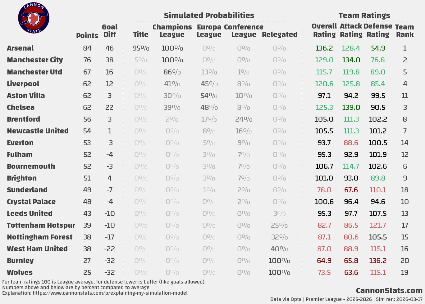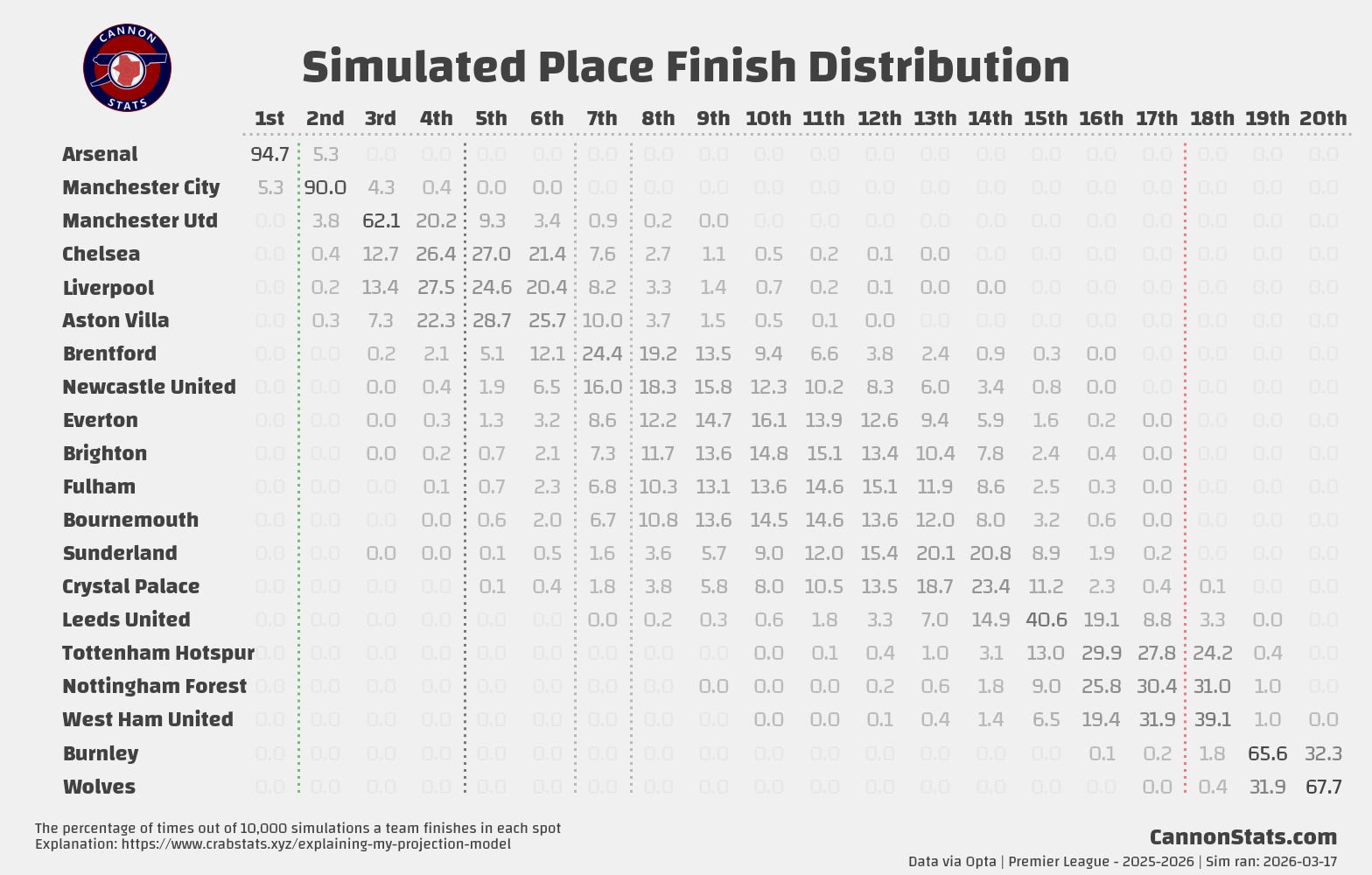 This page features Premier League projections from my model. I will try and keep this updated at least once a week after the model runs.