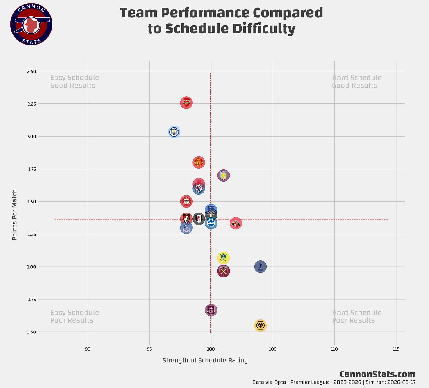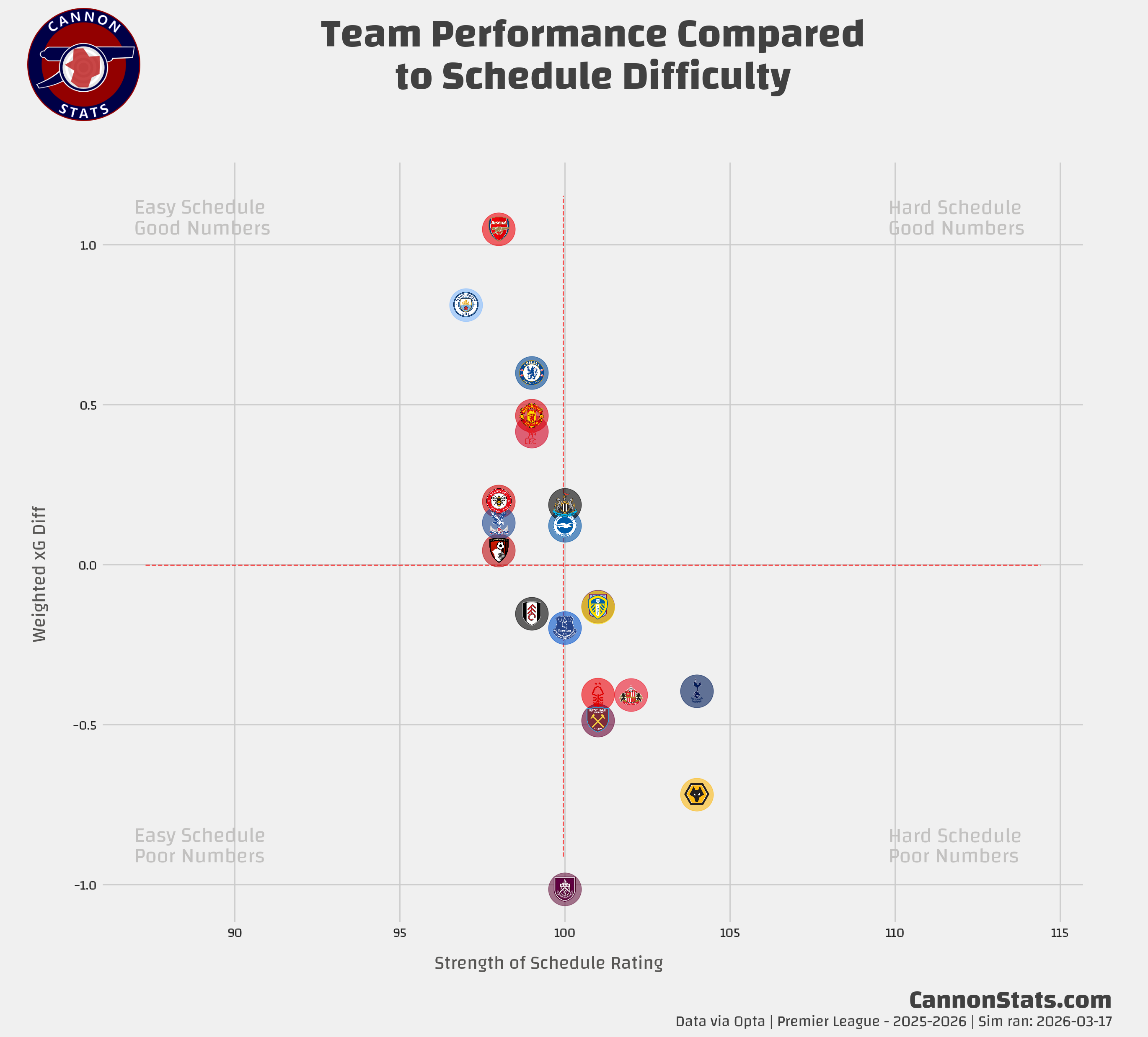 Here is how each team has performed compared to the difficulty of their schedule so far. We are still in the relative parity position around the half mark, we will potentially see some change in this over the next few weeks before everyone gets pulled back to the center again.