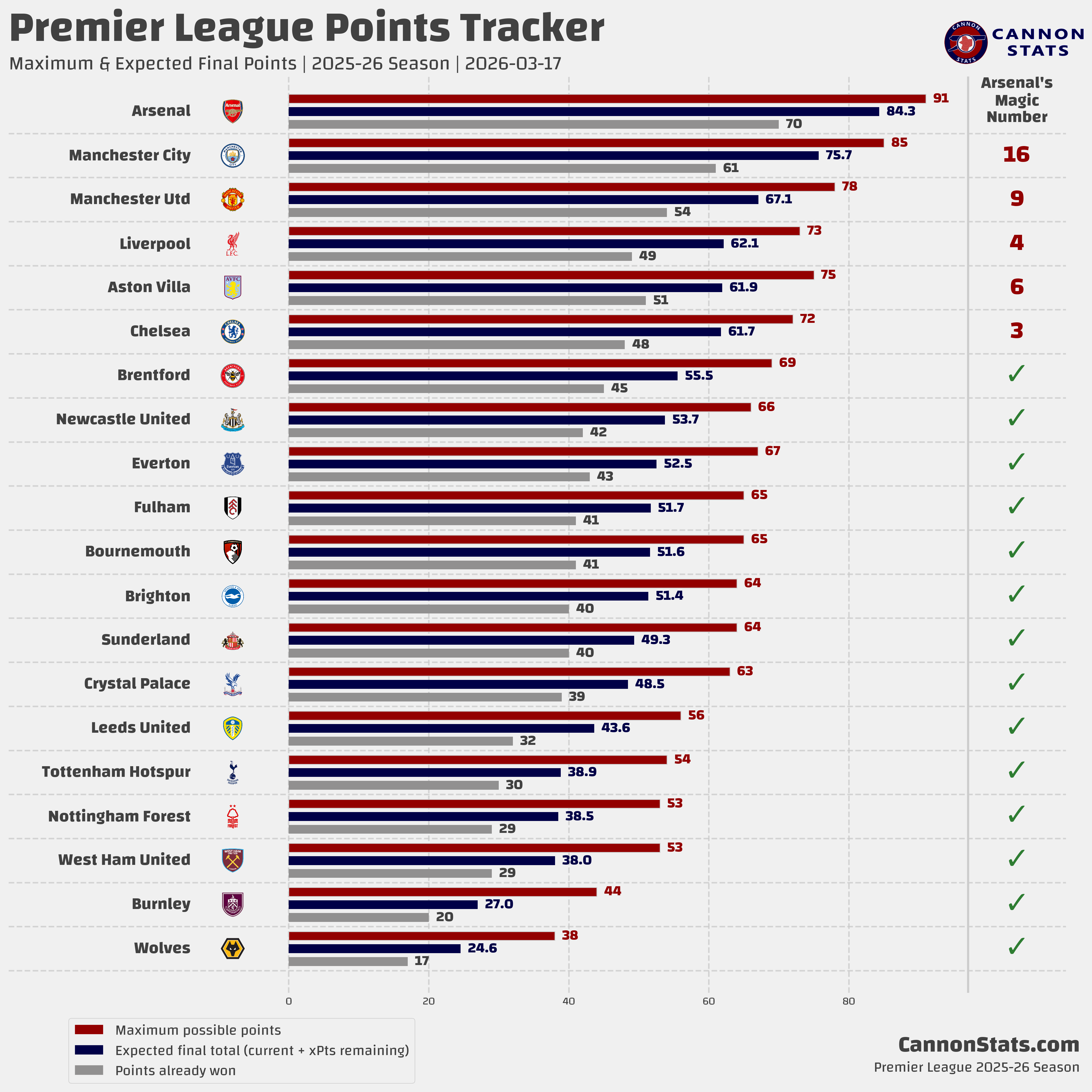 The magic numbers are back, and it is a combination of 16 points won/opposition dropped for Arsenal to win the title this season.
