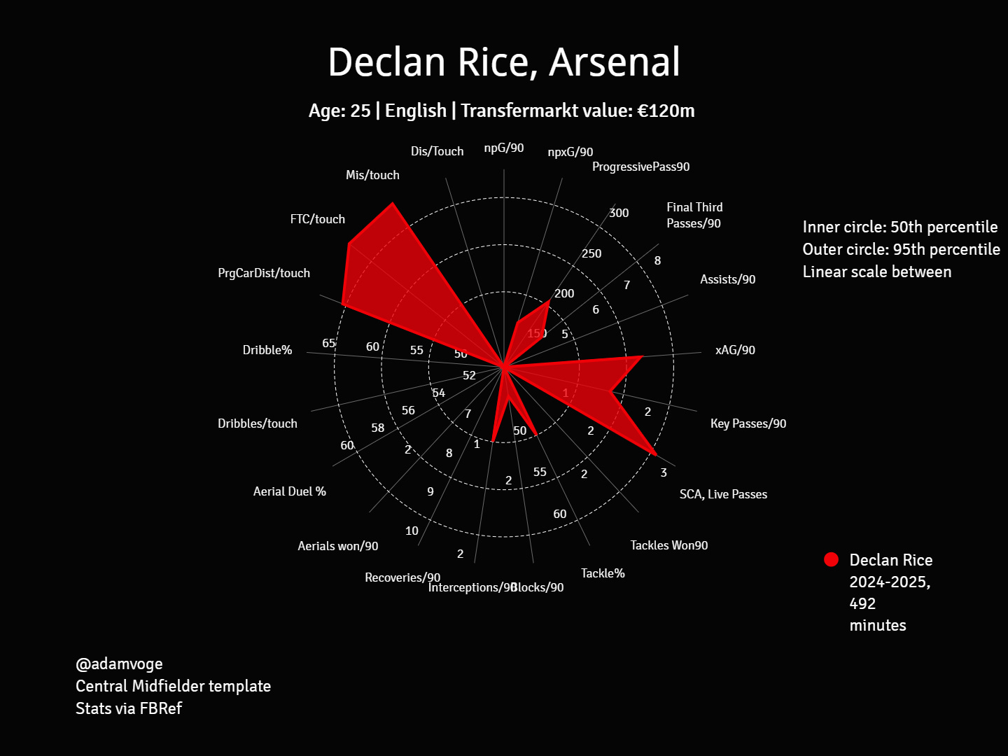 We can start with the guy who’s only eligible for this list on a technicality. Rice hasn’t actually played much of a DM role at all for Arsenal, spending far more time as an advanced midfielder as Thomas Partey holds it down deep. I don’t think he’s been quite as good as he was last season so far, but is certainly creating good chances and providing ball security. He also missed a game, making his sample even smaller. It’s early, so you can expect some noise and some really irregular charts as of now. But, thanks to the weight of last season’s score, he’d still be fifth.