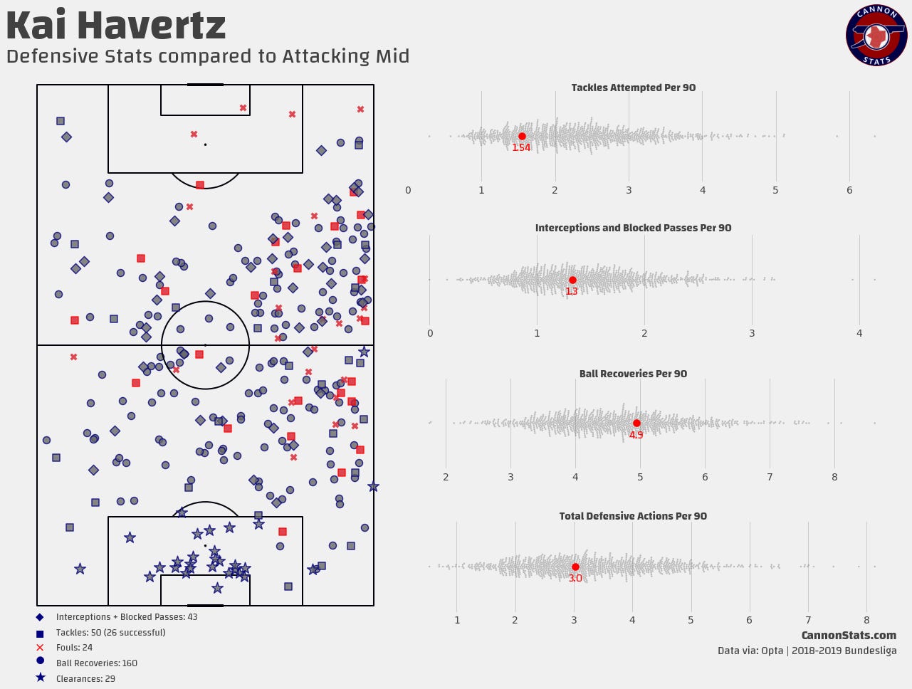 Xhaka obviously has a bit more action in the area where you would expect to see a midfielder operate but Havertz had a very good amount of defensive events for a player that started that far forward. It is a little tough because of the difference in time but going back to the 2019/19 season where Havertz played more midfield (from the right primarily) his numbers and action areas again seen to suggest that the delta between him and Xhaka may not be insurmountable.